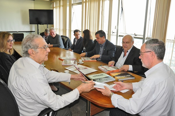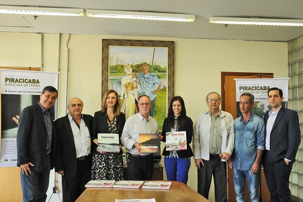 Participaram da entrega do 'Piracicaba, A Doçura da Terra', que ocorreu no gabinete do prefeito, representantes da Cosan, Raizen e da Caterpillar, empresas que patrocinaram a obra.