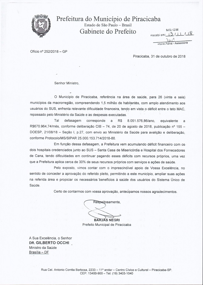 Durante a audiência, o prefeito Barjas Negri falou do ofício 252/2018, protocolado no último mês de outubro, quando se relata defasagem de R$ 8,051 milhões/ano, provocada pela manutenção do atendimento dos usuários SUS (Sistema Único de Saúde). Há uma diferença entre o que o Ministério repassa para a Prefeitura e a despesa executada.