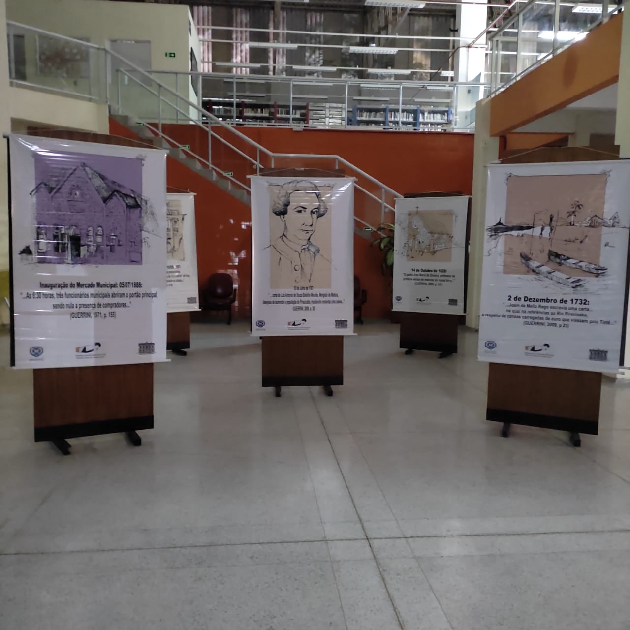 Exposição Legado das Letras, com banners ilustrando a história de Piracicaba em quadrinhos com citações da obra de Leandro Guerrini