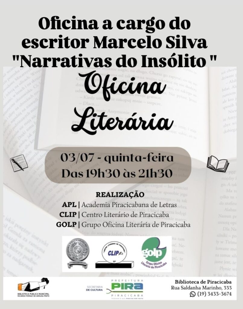 A Biblioteca Pública Municipal Ricardo Ferraz de Arruda Pinto recebe nesta quinta, 3/7, das 19h30 às 21h30, a oficina literária Narrativas do Insólito, conduzida pelo escritor piracicabano Marcelo Pereira da Silva. A atividade é gratuita e aberta ao público, voltada especialmente a leitores, escritores e interessados em literatura.