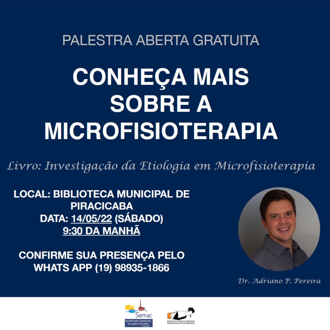 Biblioteca Municipal sedia lançamento de livro e palestra sobre microfisioterapia No livro, o autor aborda a teoria da microfisioterapia, incluindo a embriologia, filogênese e ontogenia, tópicos que também serão discutidos durante a palestra, além de realizar uma abordagem prática durante a apresentação. Com toques suaves e precisos o profissional estimula o corpo a se auto-corrigir de eventos vividos pela pessoa e não eliminados pelo organismo.