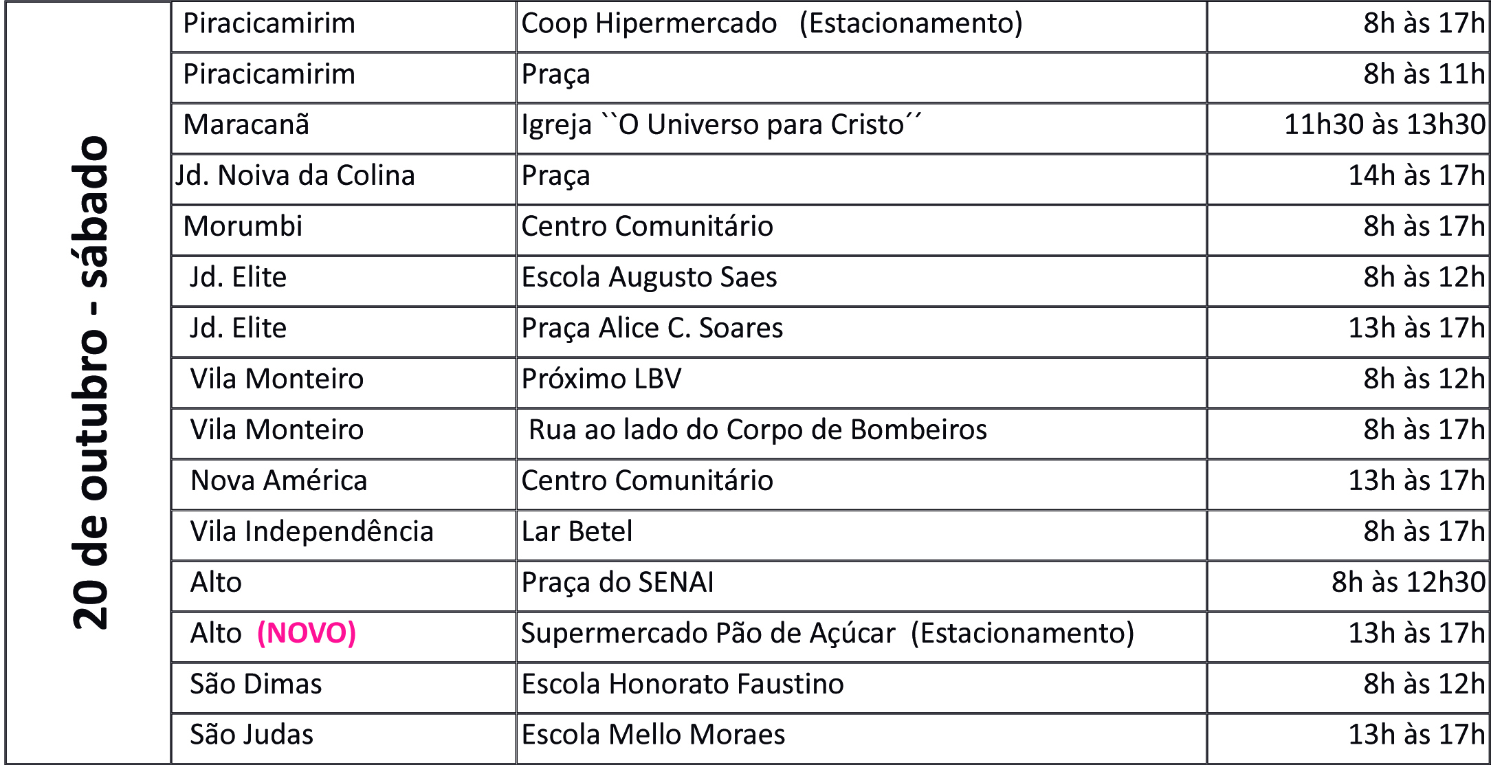 Tabela de Postos de Vacinação do 2º sábado da campanha (20/10)