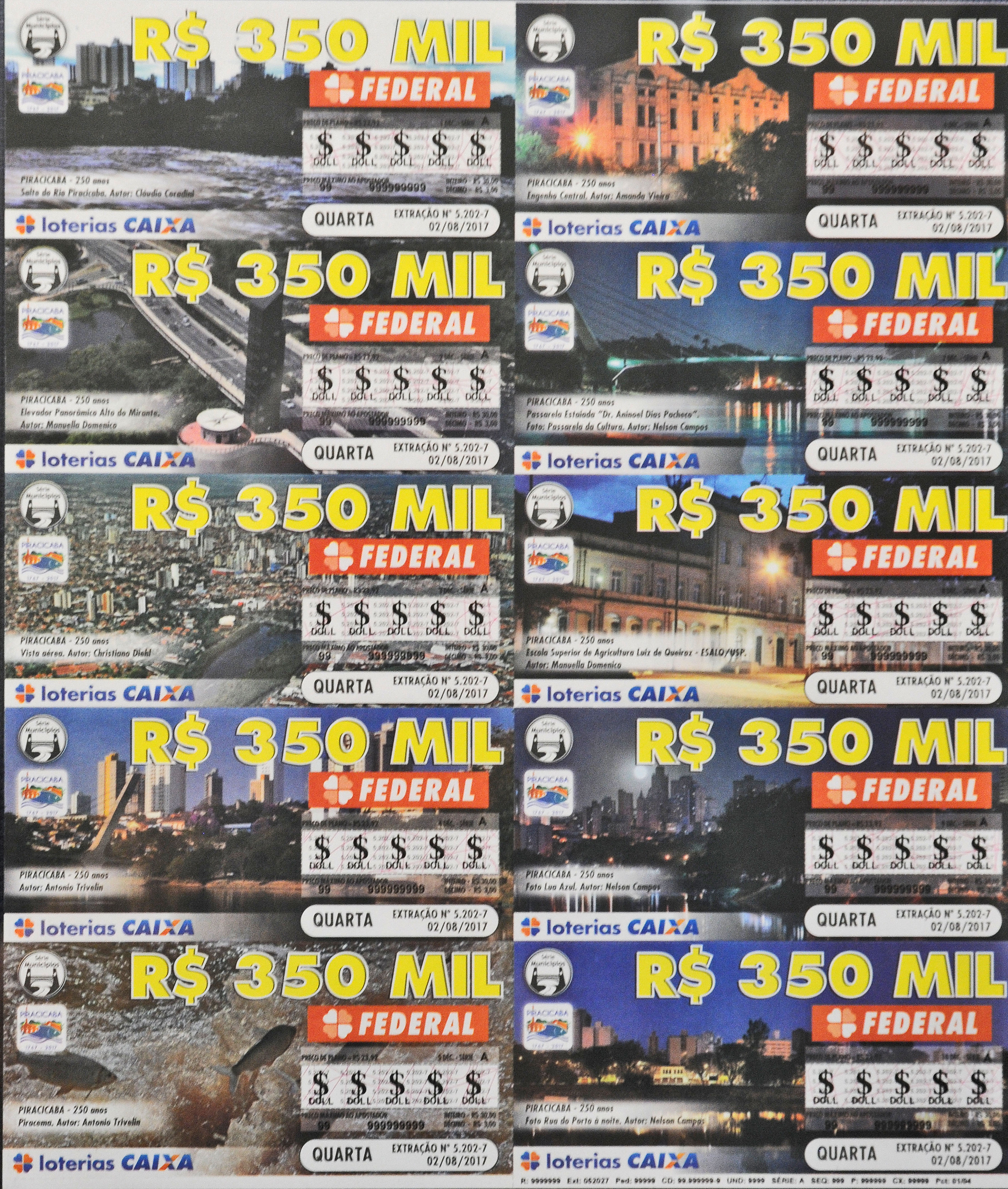 São 88 mil bilhetes, presentes em mais de 13 mil lotéricas do país. Em todos os bilhetes estão estampadas fotos da cidade e também o selo comemorativo dos 250 anos de Piracicaba. Para ilustrar os bilhetes foram selecionadas fotos dos pontos turísticos e cenários marcantes de Piracicaba, cedidas por fotógrafos profissionais da cidade. O sorteio referente à extração nº 5.202-7 ocorrerá no dia 2 de agosto próximo, às 19h, com prêmios principais nos valores de R$ 350 mil; R$ 18 mil; R$ 15 mil; R$ 12 mil e R$ 10.888,00 e os prêmios derivados irão de R$ 30 a R$ 1.200. O bilhete pode ser adquirido inteiro ou em fração e a premiação é proporcional ao que o apostador adquire. Por meio do aplicativo Caixa para tablet e smartphone estão disponíveis os resultados das loterias, jogos, endereços das lotéricas e valores dos prêmios.