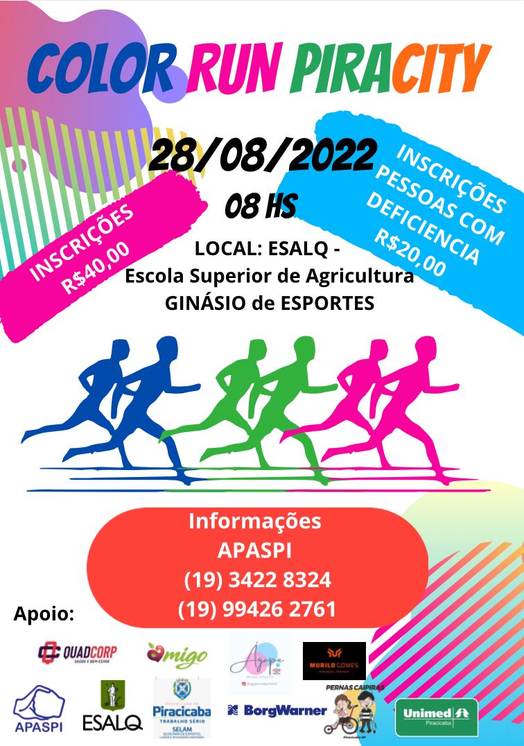A Associação de Pais e Amigos de Surdos de Piracicaba (Apaspi) realiza no domingo, 28/08, a 1ª edição da Color Run Piracity, caminhada colorida, inclusiva e solidária. A ação tem apoio da Prefeitura de Piracicaba e acontecerá na Esalq (Escola Superior de Agricultura Luiz de Queiroz/USP), com concentração a partir das 7h30, no ginásio de Esportes da Esalq, que também apoia o evento, além do Pernas Caipiras.