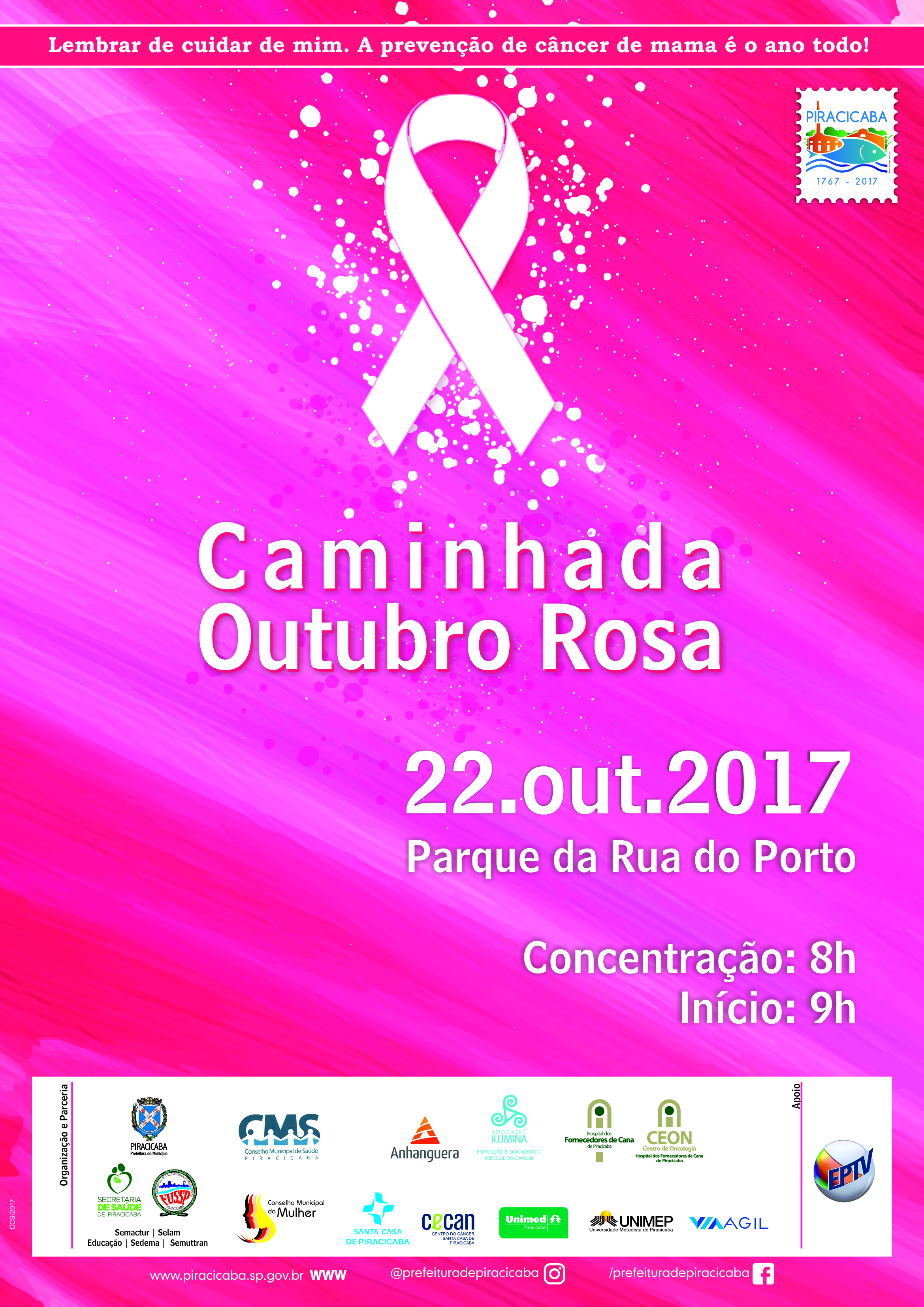 Não se esqueça, neste domingo, 22, acontece a Caminhada Outubro Rosa, no Parque da Rua do Porto. A concentração começa às 8 horas, perto do Sino da Paz, com participação livre e gratuita. Basta ir com traje esportivo e algum adereço rosa relativo ao mês, em que as unidades de saúde de Piracicaba se concentram na campanha de prevenção ao cancer de mama e colo de útero.