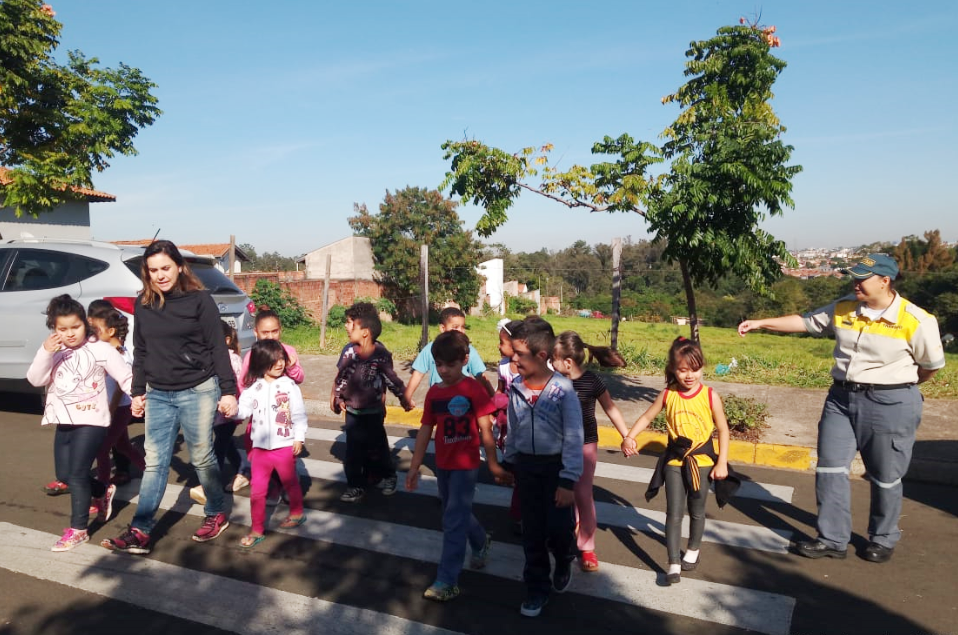 Na manhã desta quarta-feira, 12, agentes de trânsito visitaram a escola Professor Roberto Damas da Silva e praticaram com as crianças a travessia da faixa de pedestre, além de realizarem diversas atividades lúdicas.