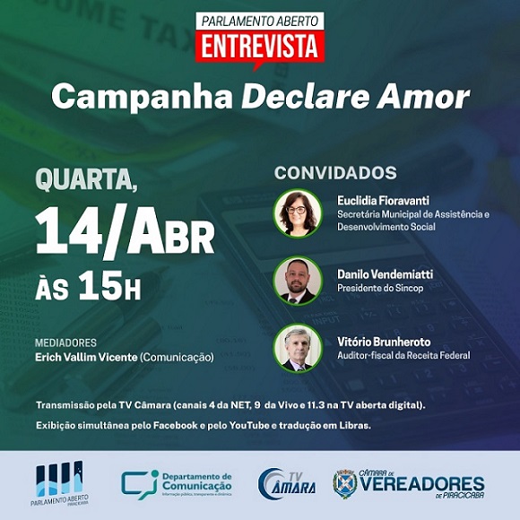 Amanhã, quarta-feira, 14/04, a partir das 15h, o programa Parlamento Aberto Entrevista, da Ca?mara de Vereadores de Piracicaba, terá como tema de debate a campanha Declare Amor, que incentiva a doação ao Fundo Municipal dos Direitos da Criança e do Adolescente (Fumdeca) e ao Fundo Municipal do Idoso, na hora de declarar o Imposto de Renda. A possibilidade de destinação não tem qualquer custo ao contribuinte. Os convidados serão a titular da Secretaria Municipal de Assistência e Desenvolvimento Social (Smads), Euclidia Fioravante, o delegado da Receita Federal em Piracicaba, Vitorio Brunherotto, e o presidente do Sindicato dos Contabilistas de Piracicaba (Sincop), Danilo Vendemiatti. A Campanha Declare Amor, realizada pela Prefeitura de Piracicaba, Conselho Municipal dos Direitos da Criança e do Adolescente e Fundo Municipal do Idoso, junto à Sicoob Cocre, ganhou força e se expandiu para mais parceiros: Ca?mara de Vereadores, Sindicato dos Bancários de Piracicaba e Região (SindBan), Tupi Transportes, e outras empresas que realizam campanha informativa com seus funcionários, como é o caso da Oji Papeis, ArcelorMittal e, este ano, a Coplacana. "O potencial de arrecadação do município é grande, mas muitas pessoas ainda não destinam por desconhecerem a informação. Por isso, esses parceiros são importante instrumento de divulgação dessa ação cidadã, que não custa nada", frisou Euclidia. O programa será exibido amanhã, 14 de abril, às 15h, no canal 11.3 em TV aberta (sinal digital), 4 da Claro/Net e 9 da Vivo Fibra, com retransmissão pelas redes sociais oficiais da Câmara de Vereadores de Piracicaba, no Facebook e Youtube, com tradução em Libras.