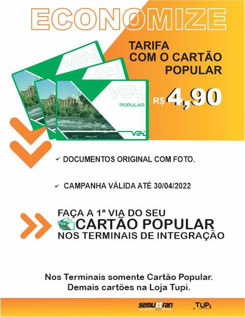Para incentivar a emissão dos cartões populares, a partir de 10/02, a empresa TUPi vai ampliar, ainda, a emissão e cadastro para todos os terminais. A primeira via do cartão é gratuita e a segunda tem a taxa de R$ 21,50, direcionado para custear a produção, impressão e demais custos dos cartões, conforme decreto municipal nº 8842/2000. Mas durante a campanha, até 30/04, o valor da segunda via tem desconto e custa R$ 11,20.