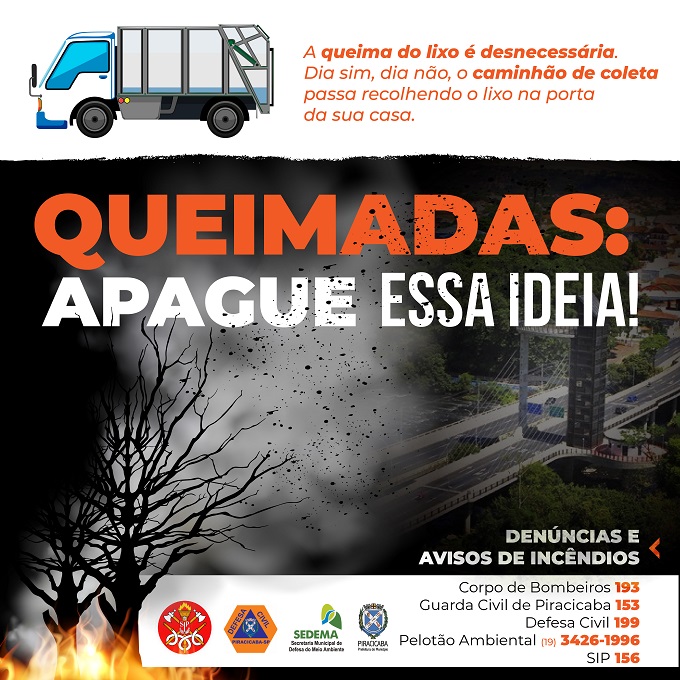 A partir desta semana, a Prefeitura de Piracicaba, por meio da Secretaria Municipal de Defesa do Meio Ambiente (Sedema), publica em seus canais digitais banners da campanha 'Queimadas: Apague Essa Ideia!'. O objetivo da sequência de informativos é conscientizar a população quanto aos principais fatores causadores de incêndios no município, tantos em áreas urbanas quanto rurais.