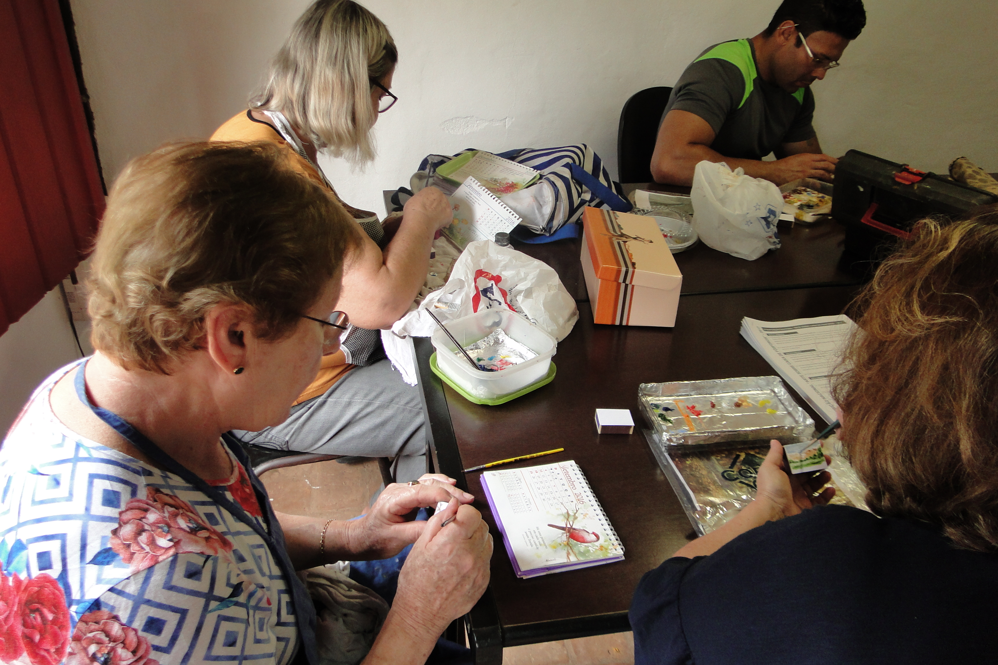 Durante a atividade, os artistas se utilizaram de tinta óleo para ilustrar sobre a pequena tela, imagens de pássaros, paisagens e pequenas esculturas.