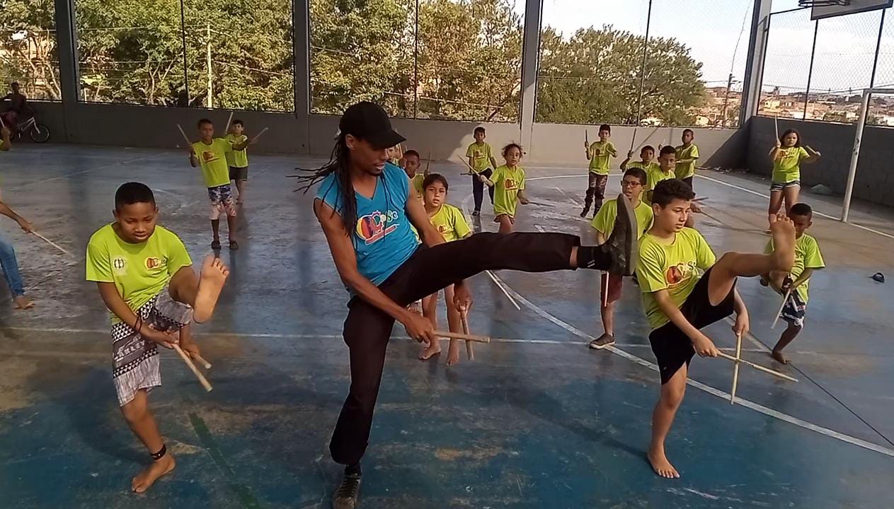 Crianças e adolescentes do Case em apresnetação de maculelê