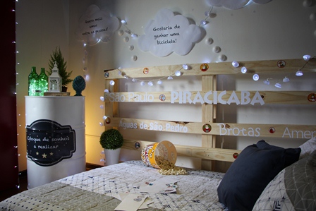 O quarto “Sonhos de Noel” foi criado pensando em um Papai Noel moderno, criativo e sustentável. O ambiente foi projetado e executado por Lívia Ferreira Arquitetura e pelo turismólogo Esdras Casarini, em parceria com a Secretaria de Turismo, e as empresas Centerval Industrial Ltda., Cópias Kroll, Exon Eventos, Grupo Pirasa, Neto Artesanato, Quero uma ideia – Carolina Giacomin e Grande Bazar Santos. “A ideia foi montar um ambiente com toques sustentáveis, uma vez que reutilizamos materiais que eram usados em outros seguimentos (que não a decoração), como: pallets, tambor, caixotes de feira, garrafas de bebidas, copos plásticos, entre outros”, afirmaram os criadores do projeto.