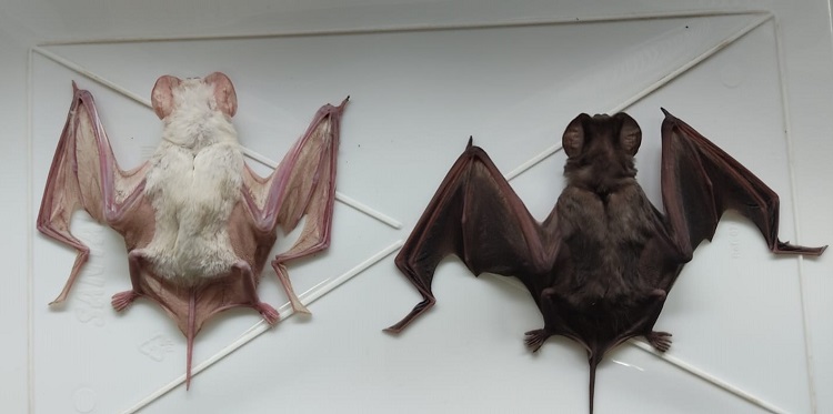 Morcego Albino ao lado de outro da cor cinza chumbo, natural da espécie