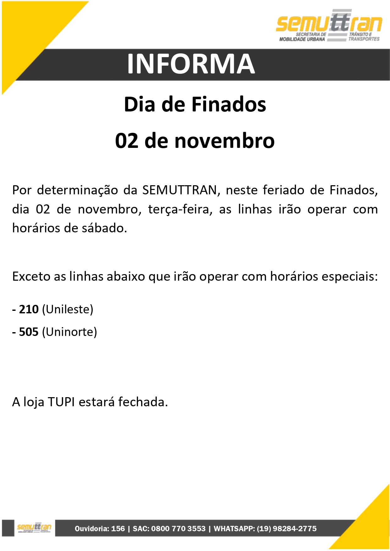 Em relação ao transporte público, as linhas vão operar com horários de sábado, exceto as linhas 210 (Unileste) e 505 (Uninorte), que vão operar com horários especiais (confira os horários abaixo).