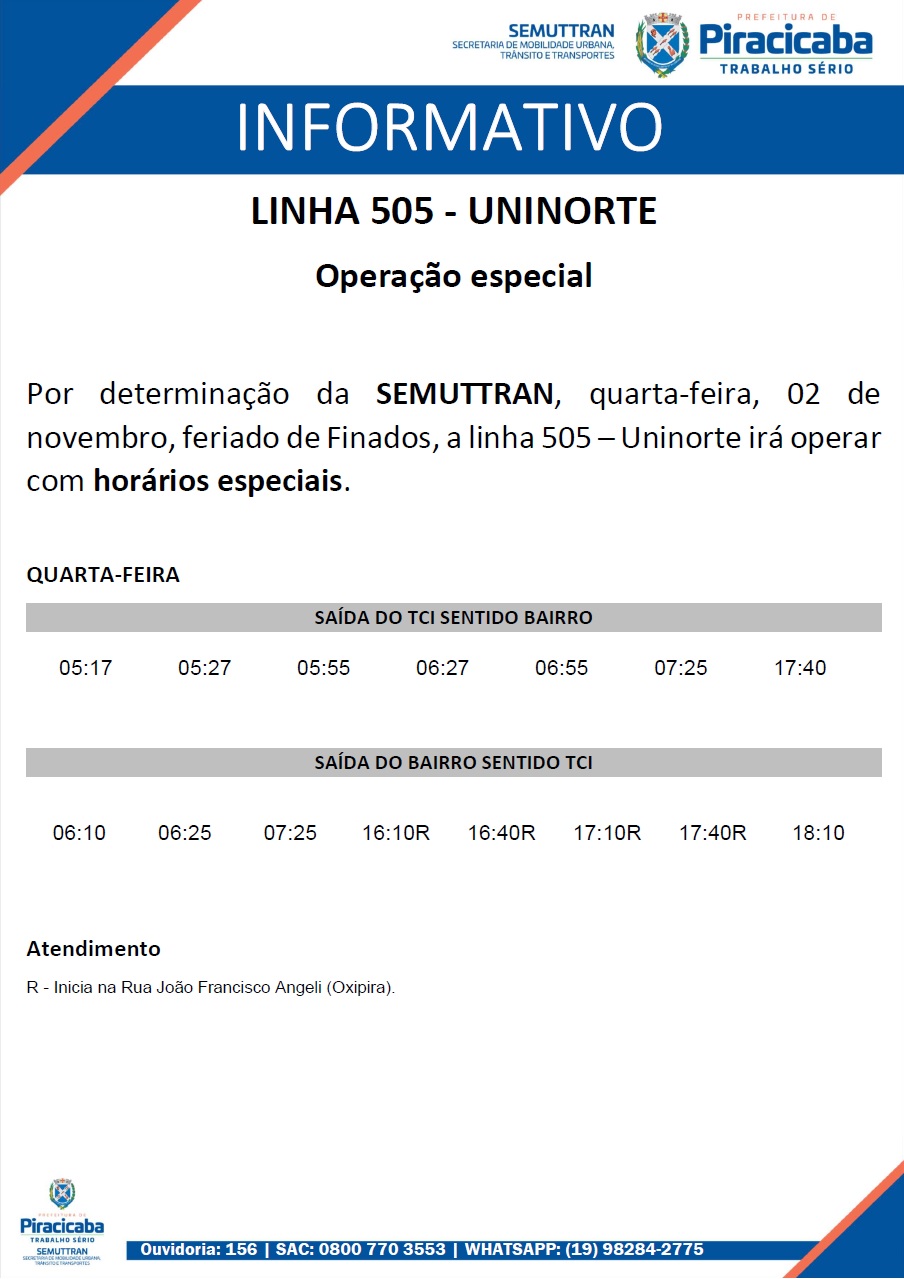 FISCALIZAÇÃO – O setor de Economia Informal da Semdettur fará a fiscalização nos dias 1 e 02/11, terça e quarta-feira, dos vendedores ambulantes que estejam atuando nos locais informalmente. A Semdettur informa que existem seis pontos autorizados disponíveis para venda de flores no cemitério da Saudade e quatro no cemitério da Vila Rezende.