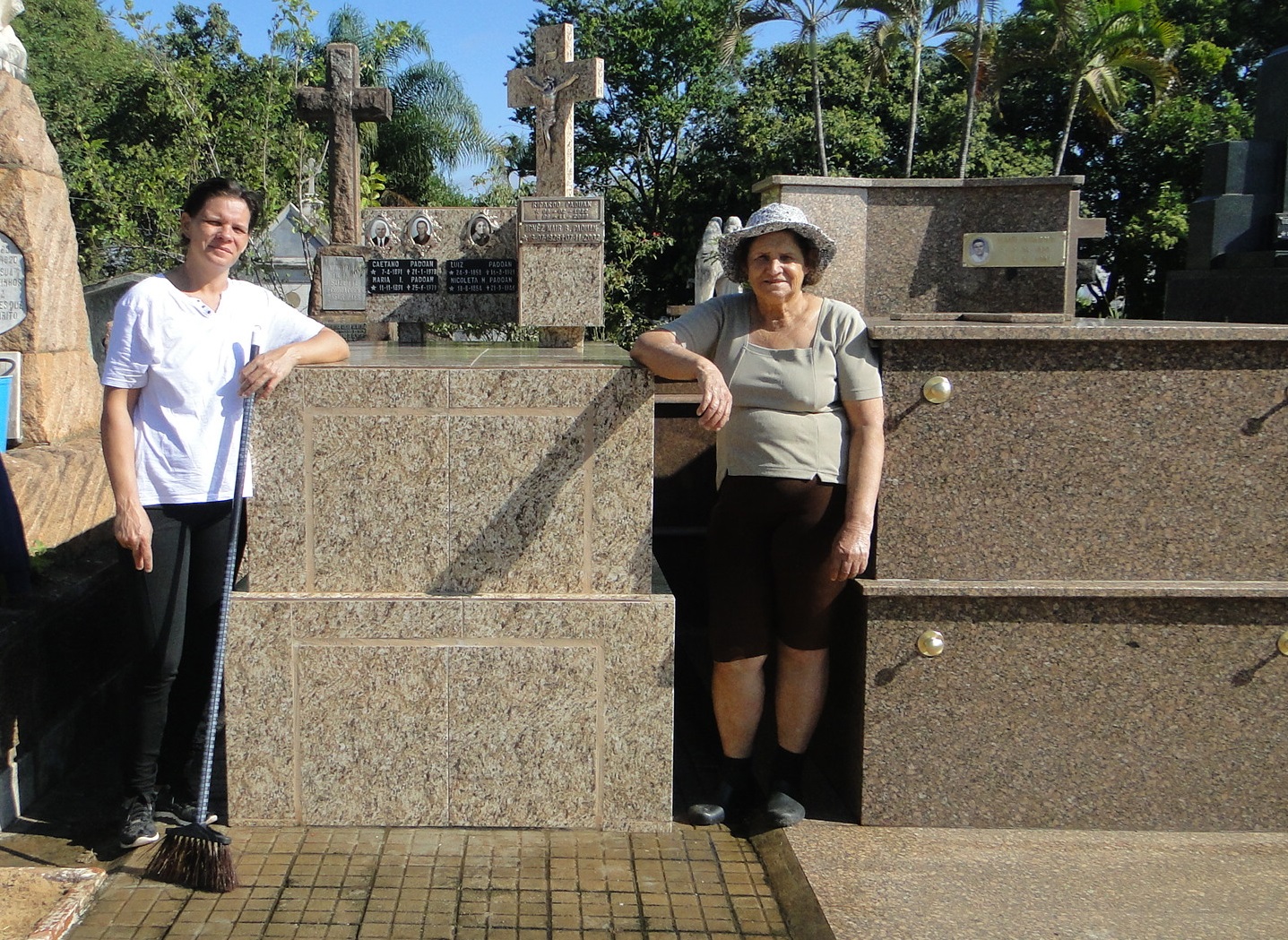 LIMPEZA – O Dia das Mães é a segunda data do ano de maior movimento nos cemitérios municipais. A primeira é dia 02/11, Finados. A limpeza de túmulos é o ganha-pão de muitas pessoas, que são autorizadas a realizar o serviço pela Prefeitura e são contratadas diretamente pelas famílias. É o caso de Dulcinéia de Fátima Oliveira Almeida, 65 anos, e a filha Juliana Cristina de Almeida, 37 anos, que começam cedo o trabalho, às 7h, no Cemitério da Saudade. “Eu faço limpeza há 47 anos. Aqui eu conheci o meu marido, que era coveiro. E a minha filha me acompanha desde os 7 anos. Daqui tiramos nosso sustento e temos muito orgulho do nosso trabalho, procuro deixar tudo sempre limpinho e brilhando”, conta Dulcinéia.