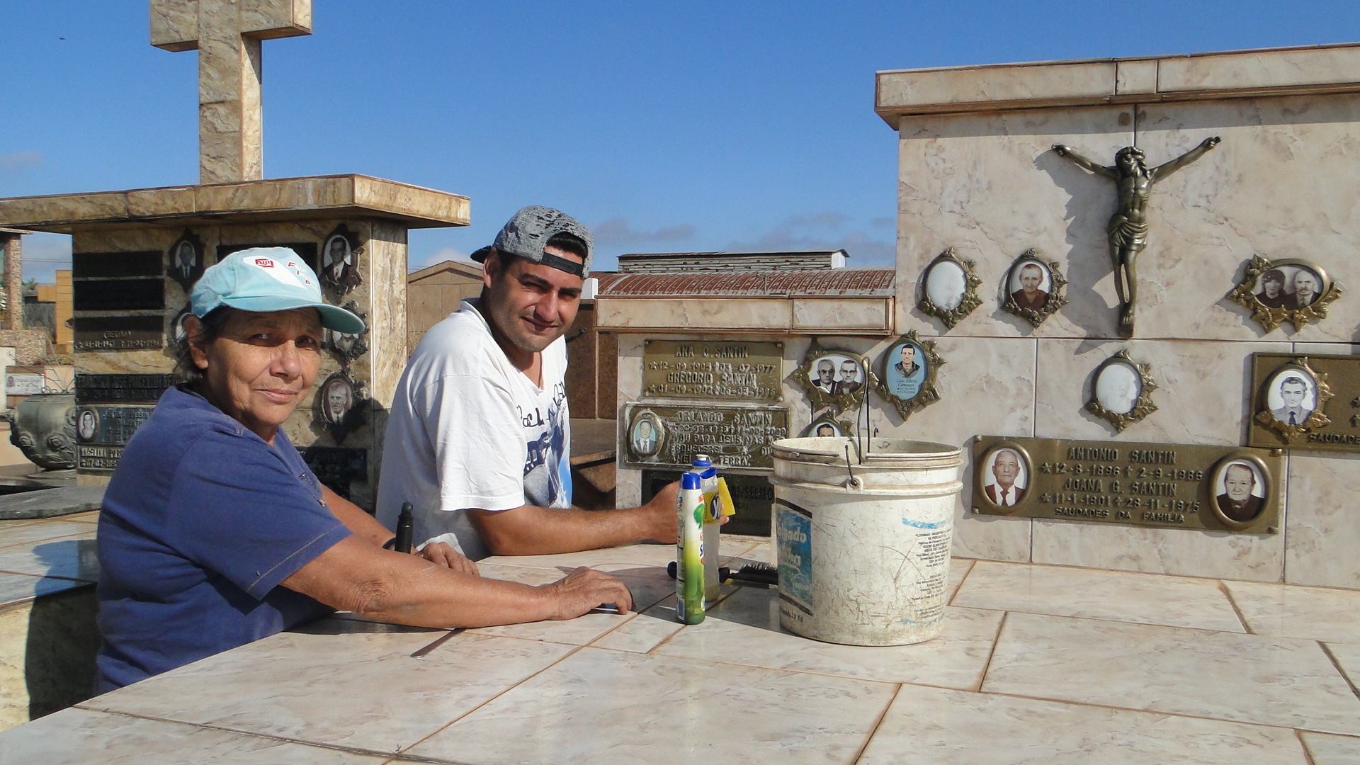 A limpeza de sepultura também começa cedo para Izilda Aparecida Cella, 64 anos, e para o filho, Emerson Gustavo Cella Antunes, 29 anos. “Nós limpamos cerca de 40 túmulos por dia, chegamos às 7h e ficamos até o meio-dia. Tomamos nosso café aqui e fazemos todo o trabalho. O Dia das Mães é sempre muito movimentado, eu faço este trabalho há 30 anos e meus pais também trabalhavam aqui”, explica Izilda.