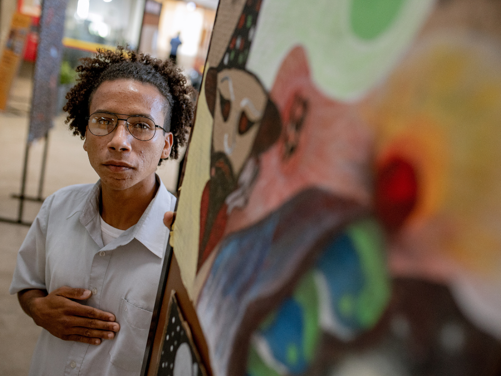 Lucas Velasco e sua obra exposta na mostra Bem-te-vi