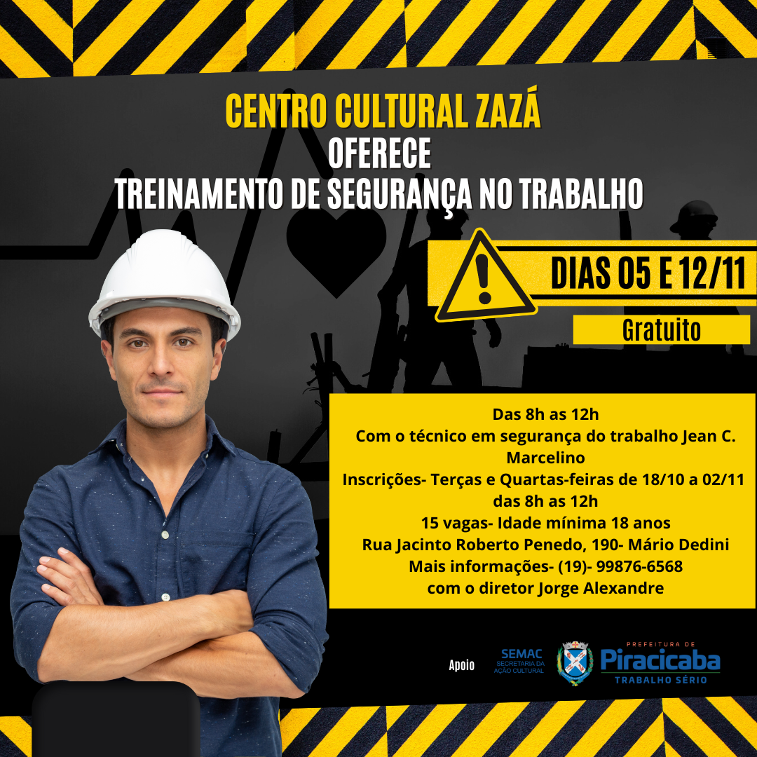 O Centro Cultural Zazá oferece nos dias 5 e 12/11, das 8h as 12h, treinamento gratuito em segurança do trabalho, com o técnico Jean C. Marcelino. São 15 vagas e a idade mínima para participar é 18 anos. As inscrições podem ser feitas todas terças e quartas-feiras, até 2 de novembro, das 8h as 12h, no próprio Centro Cultural Zazá, localizado na rua Jacinto Roberto Penedo, 190, Mário Dedini. O apoio é da Prefeitura de Piracicaba, por meio da Secretaria Municipal da Ação Cultural (Semac).