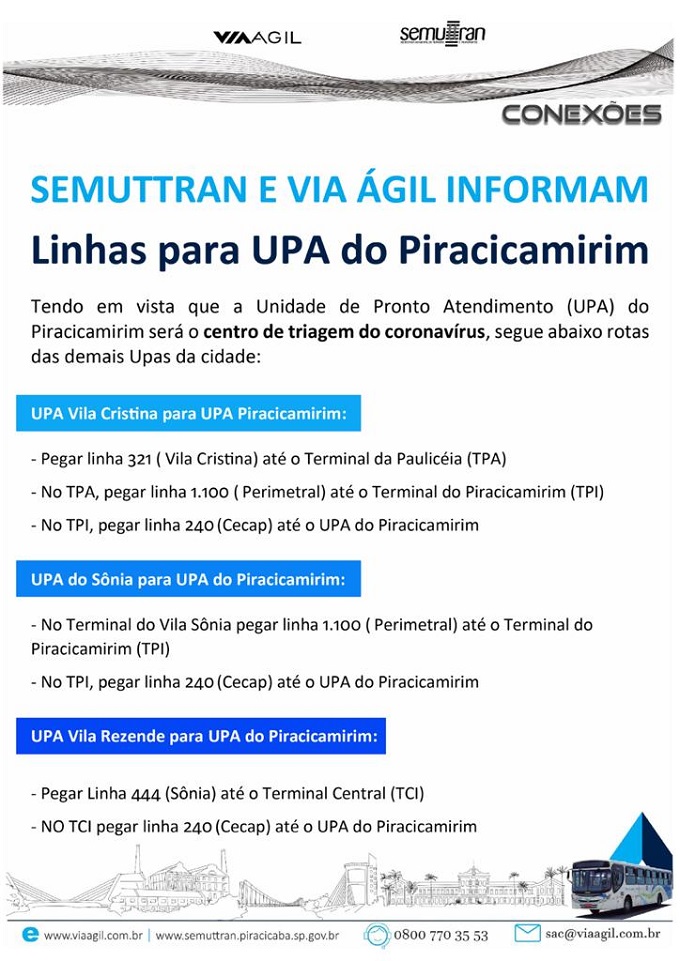 TRANSPORTE PÚBLICO – A pedido da Secretaria de Saúde, a empresa Via Ágil redefiniu algumas linhas de ônibus que darão acesso mais fácil ao Centro de Triagem do Coronavírus, atendendo aos moradores da região do Vila Sônia, Vila Cristina e Vila Rezende (Ver tabela abaixo). Informações sobre prevenção, sintomas e necessidade de atendimento médico, ligar gratuitamente para o número 0800-774-8080 (Plantão Coronavírus).