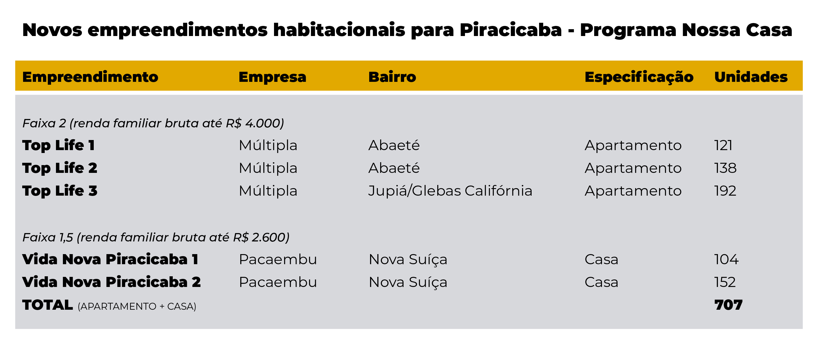Das 707 unidades, 451 se encaixam na faixa 2 (para famílias com renda bruta de até R$ 4.000) e são apartamentos, sendo térreo e mais sete andares, localizados nos bairros Abaeté e Jupiá/Glebas Califórnia, os residenciais Top Life 1, 2 e 3, construídos pela Múltipla. As outras 256 unidades são casas sobrepostas, que ficam no bairro Nova Suíça e se encaixam na faixa 1,5, para famílias com renda bruta de até R$ 2.600. A construção é feita pela Pacaembu. Cada família vai receber um cheque de R$ 11 mil do Governo do Estado.