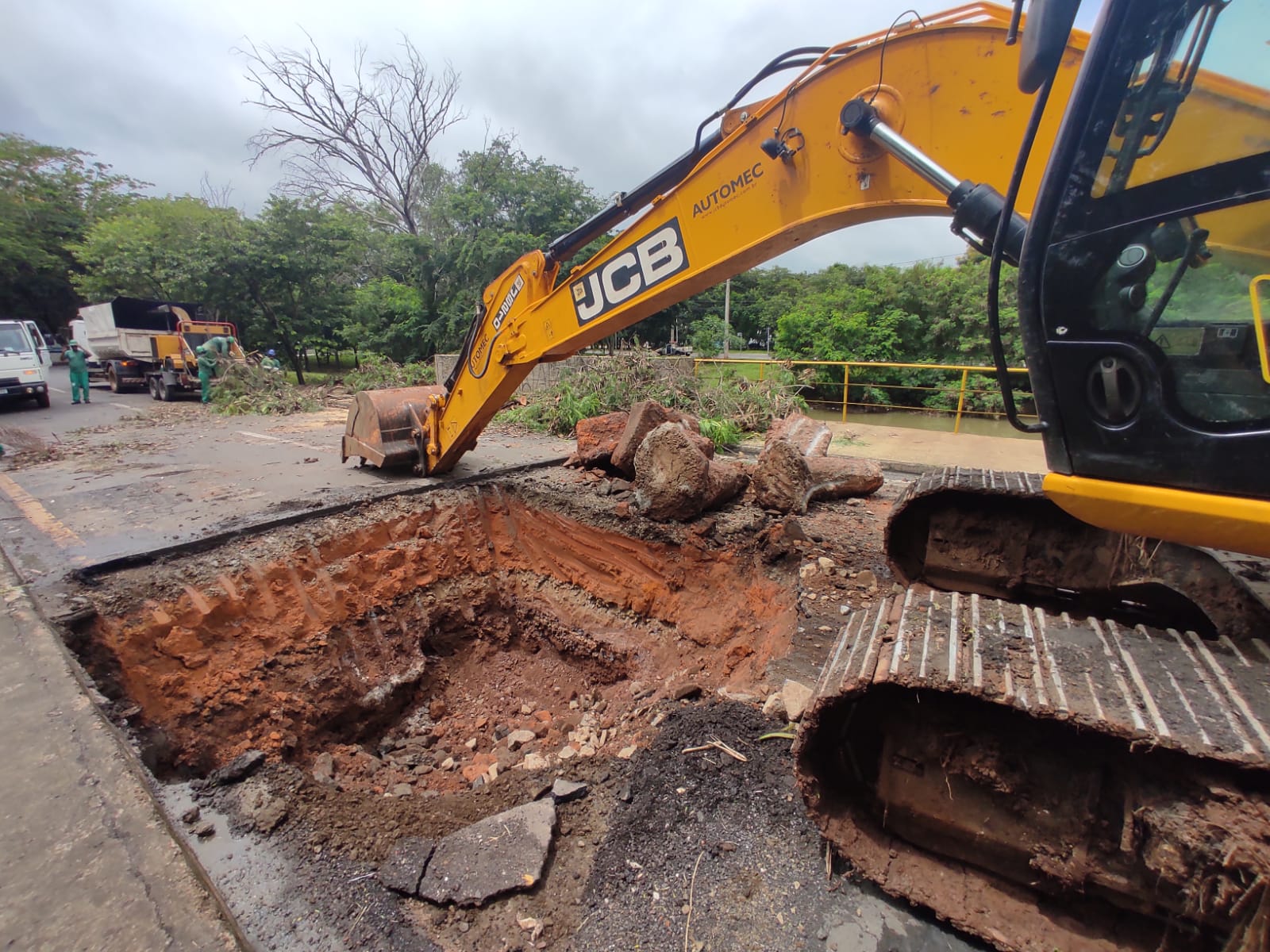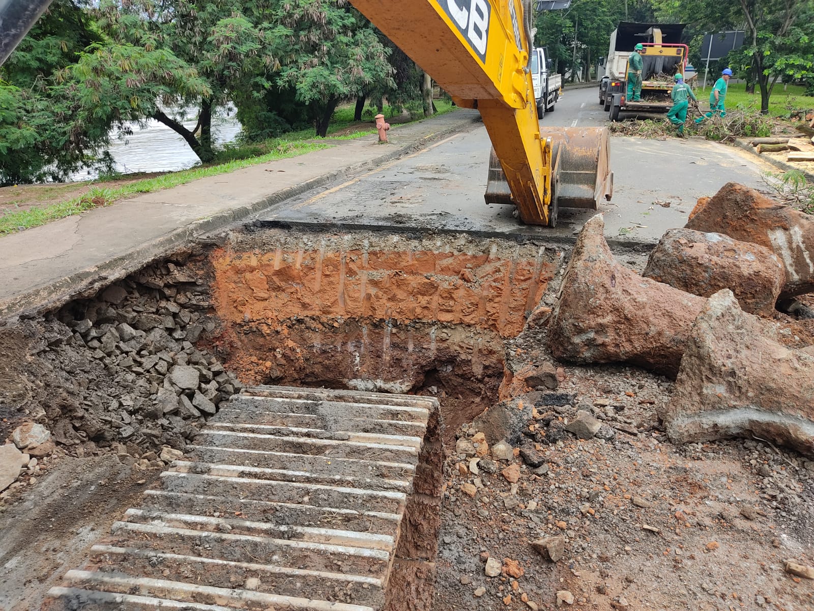 A força-tarefa da Prefeitura, coordenada pela Defesa Civil, atua em diversos pontos do município para amenizar os estragos causados pelas chuvas. A Secretaria Municipal de Obras (Semob) iniciou hoje, 03/02, o trabalho para recuperação do pavimento da avenida Jaime Pereira, sentido Centro Cívico/Carrefour (rotatória), que está interditada totalmente. Agora pela manhã, as equipes se concentram em abrir o pavimento para inspecionar a dimensão da infiltração que causou o problema. De acordo com a Semob, apenas após essa vistoria será possível determinar um prazo para finalização do serviço, ressaltando que o trabalho depende das condições climáticas. A Secretaria Municipal de Defesa do Meio Ambiente (Sedema), por meio da empresa Engemaia, também atuou no local nesta manhã para a supressão de uma leucena que prejudicava a ponte. Agentes de trânsito da Secretaria Municipal de Mobilidade Urbana, Trânsito e Transportes (Semuttran) atuam no local para orientar o fluxo do trânsito. Motoristas devem usar as avenidas Nove de Julho e avenida Cristóvão Colombo e a Estrada do Boiadeiro como rotas alternativas para acesso aos bairros. A avenida no sentido bairro-Centro permanece liberada para o trânsito.