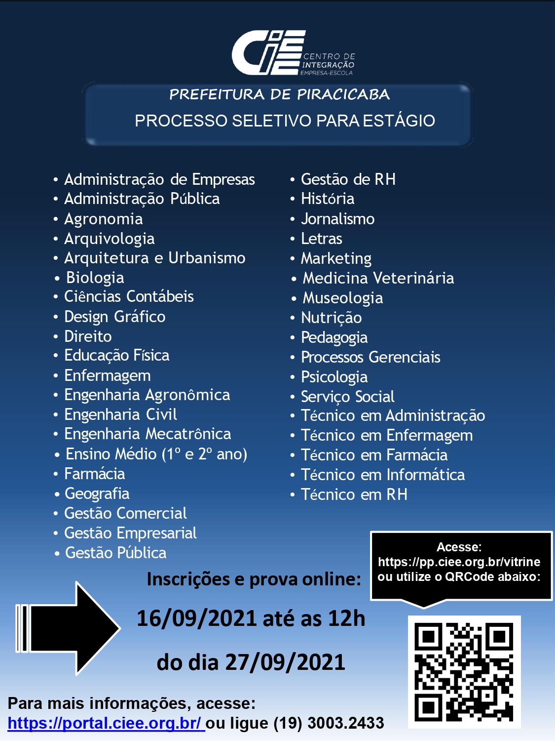 O CIEE (Centro de Integração Empresa-Escola) está com processo seletivo aberto para estágio na Prefeitura de Piracicaba em diversas áreas, como administração, agronomia, engenharias, design gráfico, psicologia, técnico em informática e recursos humanos e muitas outras.