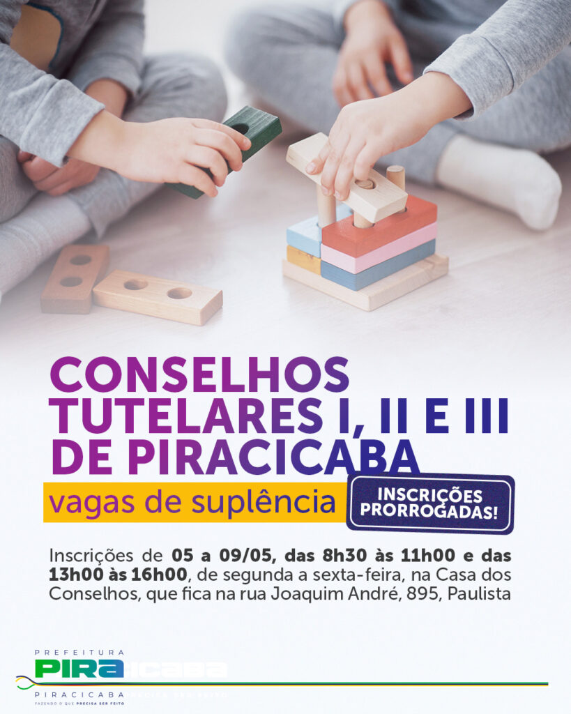 O Conselho Municipal dos Direitos da Criança e do Adolescente (CMDCA), por meio da Secretaria Municipal Assistência e Desenvolvimento Social e Família, prorrogou o prazo de inscrição para preenchimento de vagas de suplência dos Conselhos Tutelares I, II e III de Piracicaba. As inscrições, gratuitas, ficarão abertas de 05 a 09/05, das 8h30 às 11h e das 13h às 16h, na Casa dos Conselhos (rua Joaquim André, 895 Paulista). Com isso, a data da eleição foi alterada para 24/08.