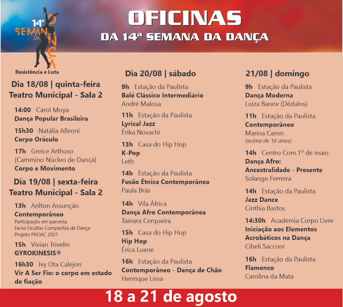 "No dia 19, especialmente, nós receberemos uma participação especial do professor Arilton Assunção como oficina de contemporâneo, que é uma parceria da Companhia Faces Ocultas com apoio do Proac 2021. Nos dias 20 e 21 acontecem as oficinas com diferentes linguagens na Estação da Paulista, na Casa do Hip Hop, no Centro Cultural Vila África, no Centro comunitário Parque Primeiro de Maio e no Corpo Livre, toda a programação está nas redes sociais do Coletivo Anônimos da Dança", explica Fernanda.