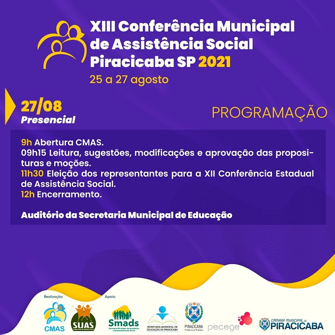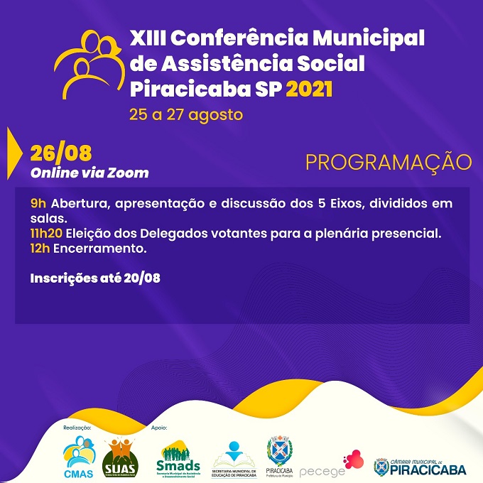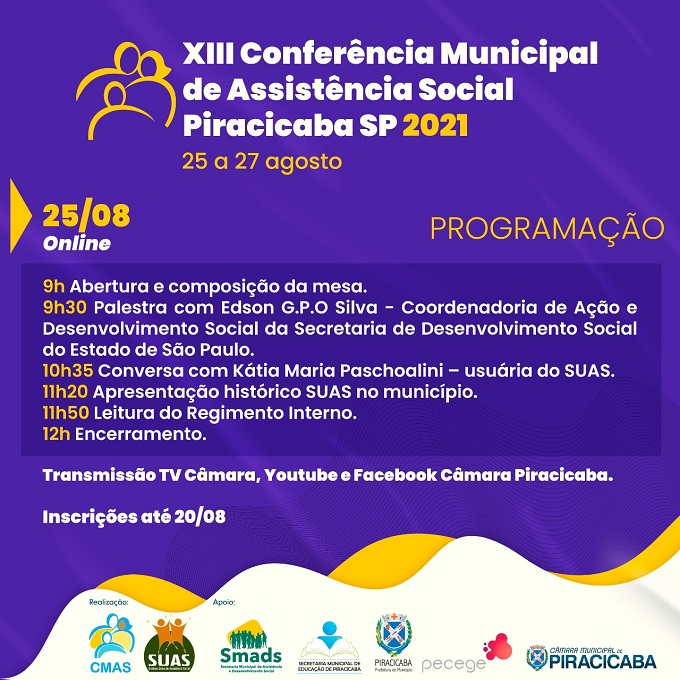 A Conferência tem realização do Conselho Municipal da Assistência Social (CMAS) e conta com o apoio da Prefeitura, por meio da Secretaria Municipal de Assistência e Desenvolvimento Social (Smads), da Secretaria Municipal de Educação, da Câmara de Vereadores e Instituto Pecege. Inscrições pelo link: bit.ly/XIIIConferencia