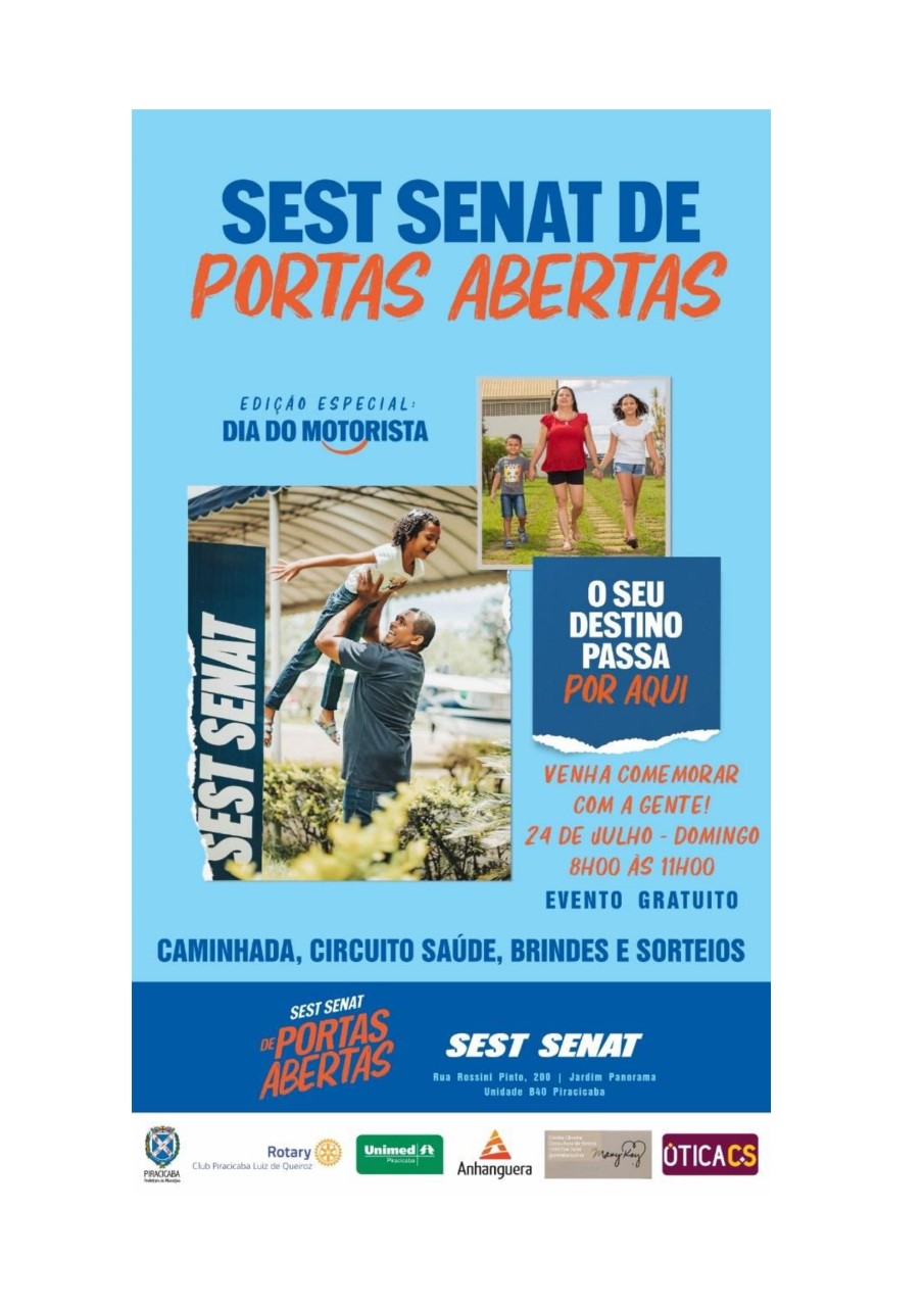 Com apoio da Prefeitura, por meio da Secretaria Municipal de Mobilidade Urbana, Trânsito e Transportes (Semuttran), a unidade do Sest Senat em Piracicaba realiza no domingo, 24/07, das 7h30 às 11h, o evento Portas Abertas em comemoração ao Dia do Motorista, celebrado na segunda-feira, 25/07. Na programação os participantes poderão conhecer as dependências do Sest Senat e seus serviços nos setores de saúde, esporte, lazer, cultura e desenvolvimento profissional. O evento é aberto ao público e todos os participantes receberão brindes.