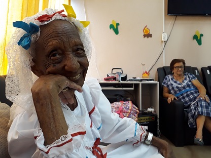 A baiana Francisca Adelina de Novaes, 95 anos, estava animada no posto de noiva no arraiá de hoje. “Aqui a gente canta, dança, faz amizades. Antes de vir para cá, eu ficava solitária em casa, já que o povo da minha casa saía para trabalhar”, contou ela, que frequenta o Centro há dois anos, todos os dias.