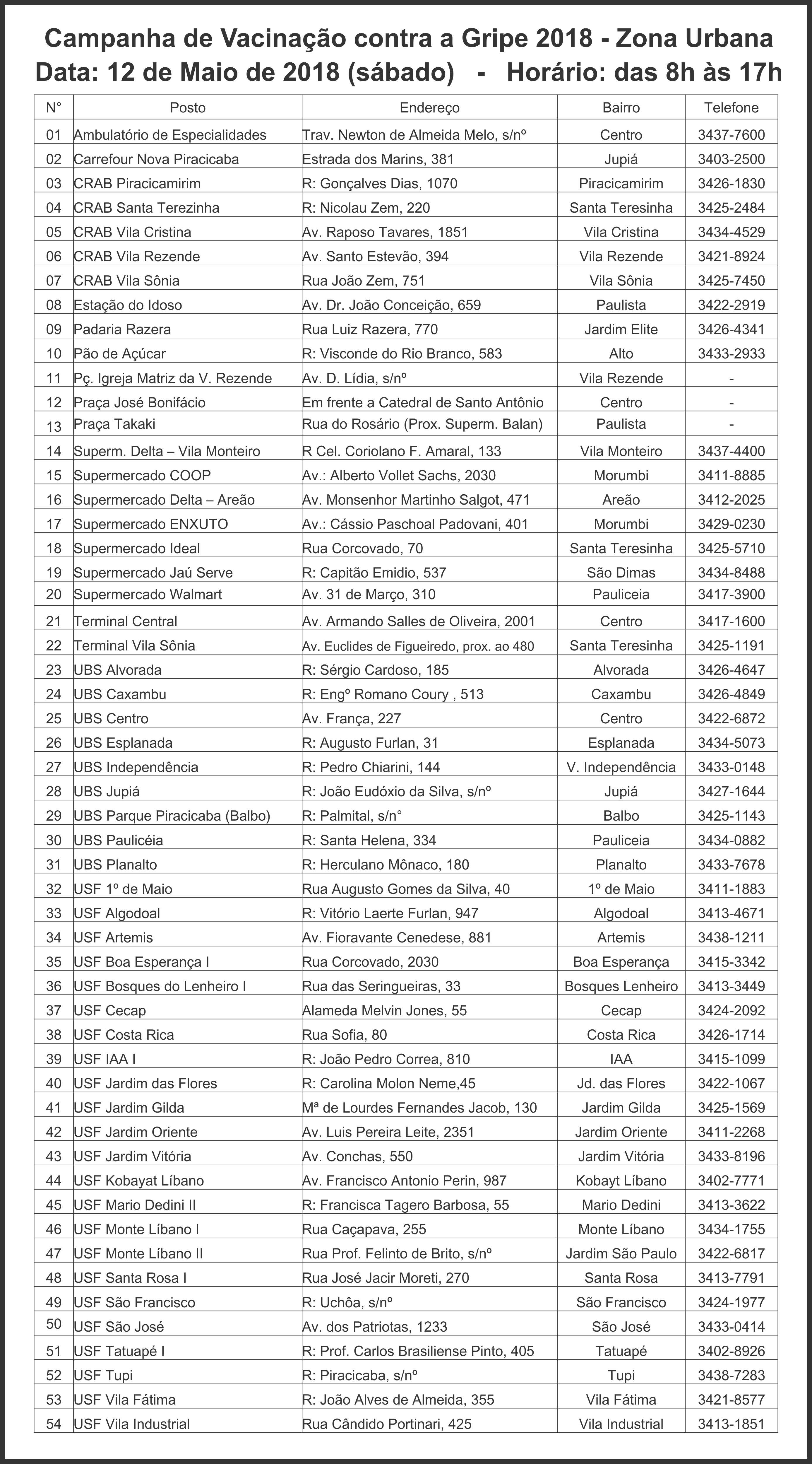 Somente os 37 postos fixos oferecerão a vacina fracionada contra a febre amarela. Os postos fixos e volantes vacinarão contra a gripe. Segue abaixo lista de todos os postos, fixos e volantes: