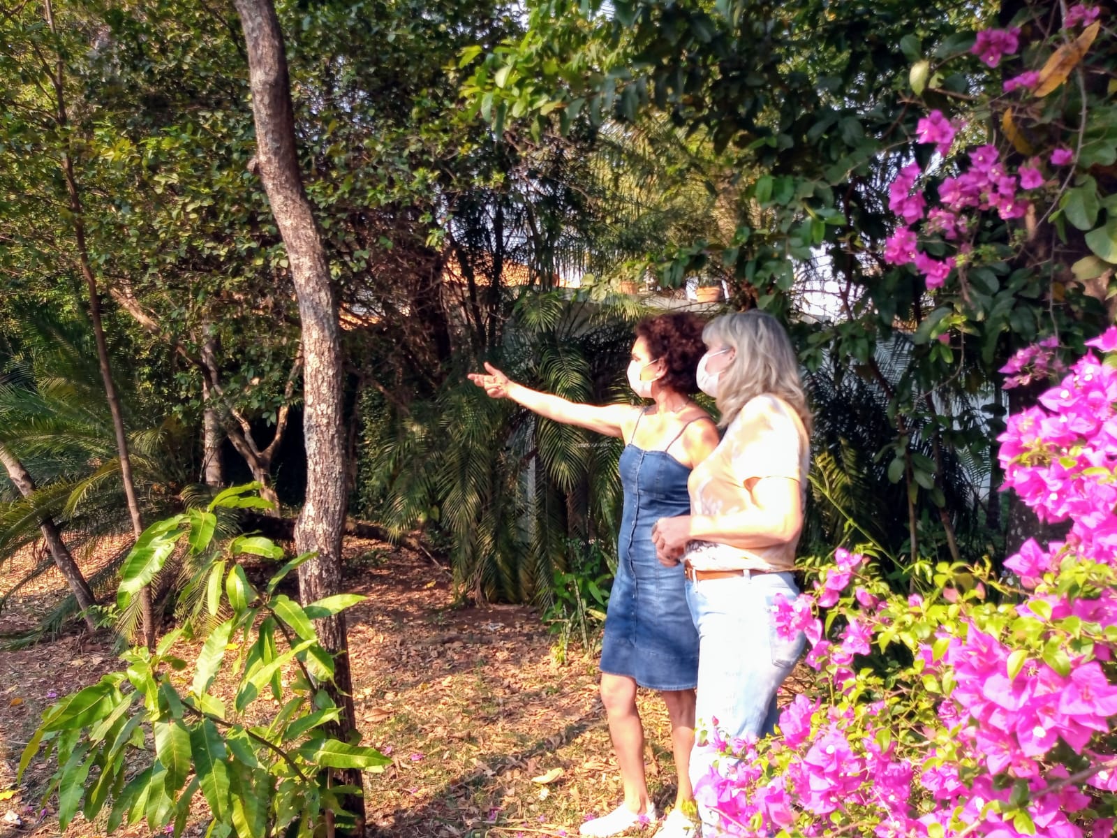 Eveline Blumer e Márcia Lebre no bosque de árvores frutíferas da praça Nhô Serra