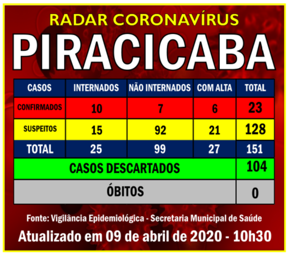 Um novo caso CONFIRMADO nesta quinta-feira. Trata-se de um homem de 60 anos, que está internado em hospital particular e não possui histórico de viagem