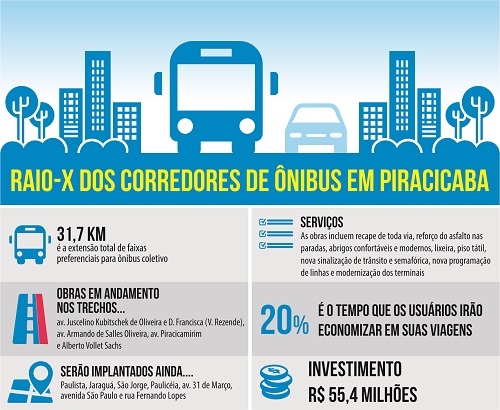 Redução no tempo de viagem no transporte coletivo e modernização dos terminais urbanos, melhora no tráfego de veículos em geral e novo asfalto em toda a extensão de várias vias da cidade. Essas são algumas das melhorias que as obras dos Corredores de Ônibus, realizadas pela Prefeitura de Piracicaba, irão proporcionar para a população.