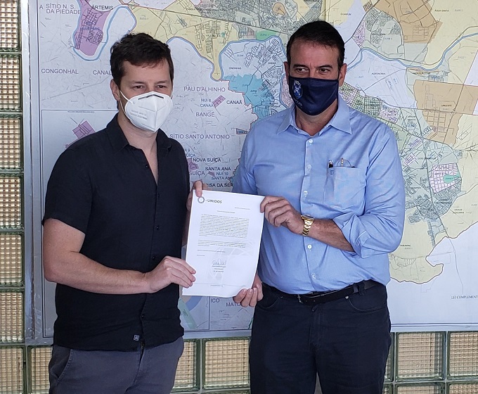 Daniel Grynberg da +Unidos e o prefeito Luciano Almeida durante assinatura do termo de parceria