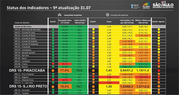 Ainda sem uma resposta, o prefeito autorizou a Procuradoria-geral a impetrar a ação para tentar conseguir a mudança de fase da cidade. O secretário de Saúde, dr. Pedro Mello, lembrou que, com o apoio do Estado, a região ganhou novos respiradores o que permitiu aumentar a sua retaguarda de atendimento com a criação de novas UTIs. No caso de Piracicaba, por exemplo, o número de UTIs dobrou em quatro meses. No status de indicadores, entre os critérios do Plano São Paulo, a região tem duas classificações Laranja e mais duas Amarela, além de uma Verde. Rio Preto tem três Laranja, uma Amarela e uma Verde.
