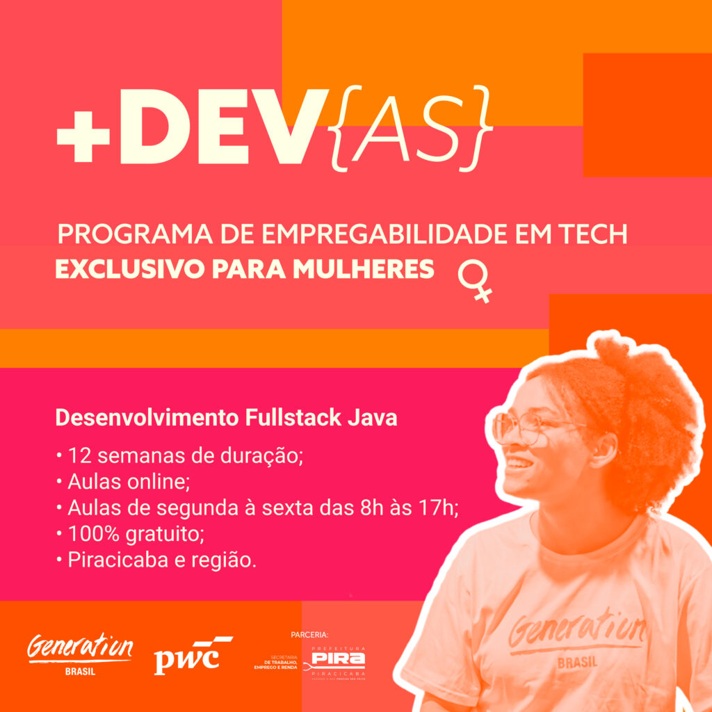 O curso é promovido pelas empresas PwC DTS Brasil e Generation Brasil, em parceria com Prefeitura de Piracicaba, por meio da Secretaria de Trabalho, Emprego e Renda. A formação será totalmente online (aulas ao vivo) e destinada a moradoras de Piracicaba e cidades da região, com ensino médio completo, idade a partir de 18 anos, que estejam sem vínculo empregatício.