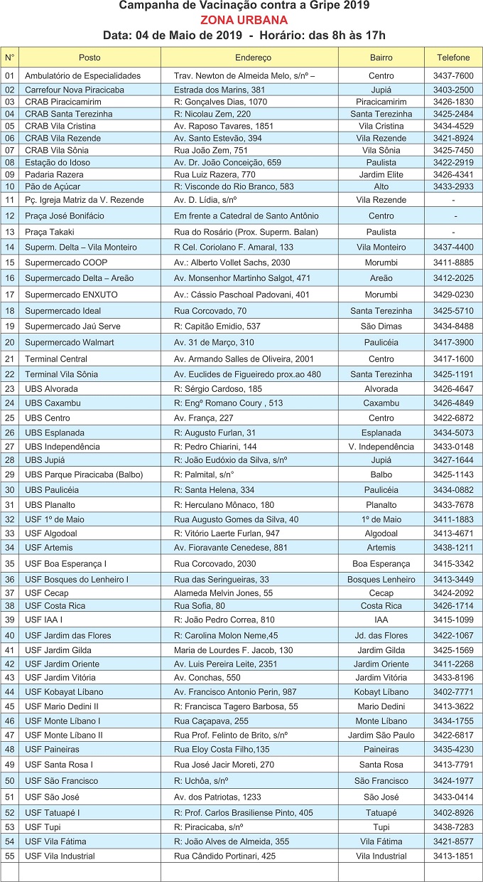 Neste sábado (04/05) será realizado o Dia D da Campanha Nacional de Vacinação Contra a Gripe (Influenza) em toda a área urbana de Piracicaba. Vão funcionar, das 8h às 17 horas, 38 postos de saúde da Atenção Básica e mais 17 postos adicionais, localizados em pontos estratégicos da cidade, como terminais de ônibus e supermercados, conforme tabela abaixo. O objetivo é facilitar a imunização de todas as pessoas que precisam se vacinar, mas não têm tempo disponível de segunda a sexta-feira. O Dia D envolverá cerca de 240 profissionais da Secretaria de Saúde.