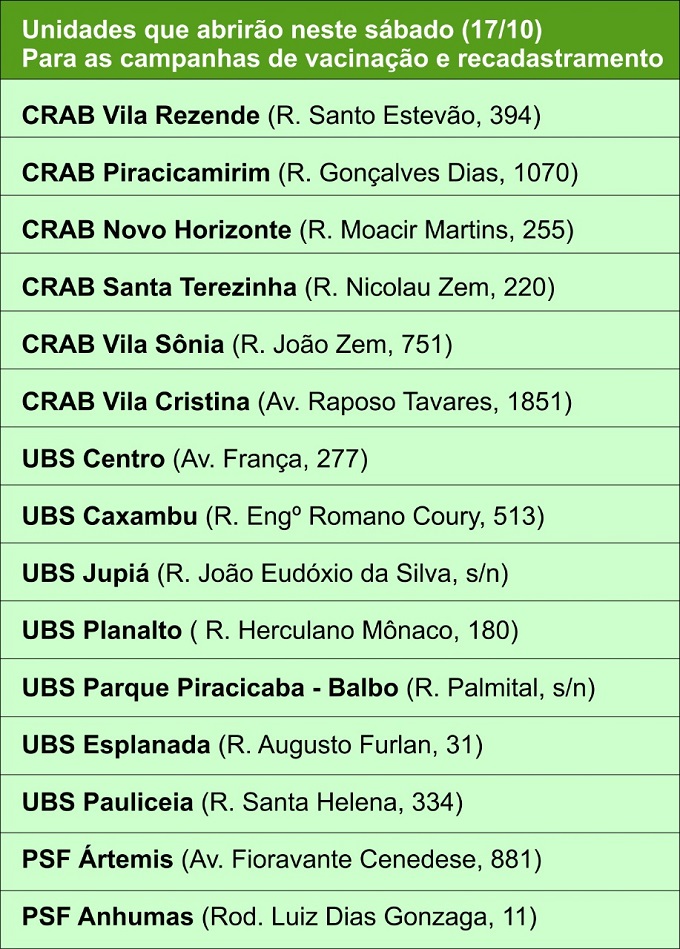 RECADASTRAMENTO – Ainda neste sábado, as mesmas unidades de saúde estarão recadastrando os moradores das áreas de abrangência das UBSs e CRABs. Se a sua família ainda não foi recadastrada, aproveite a oportunidade e leve os documentos necessários para a atualização dos dados. Esta atitude é fundamental para que Piracicaba possa garantir atendimento SUS de qualidade em todos os postos de saúde de atenção primária, como o postinho do seu bairro.