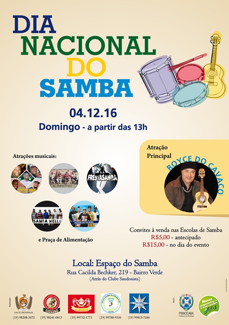 O Espaço do Samba, inaugurado pela Setur no mês de novembro, recebe no próximo domingo, dia 04/12, o Dia Nacional do Samba, um evento realizado pelas Escolas de Samba de Piracicaba, com apoio da Prefeitura Municipal, por meio da Secretaria de Turismo. Este ano haverá venda de convites, sendo R$ 5 reais para quem comprar antecipado, e R$ 15 reais no dia do evento, e o dinheiro será revertido para as Escolas de Samba. O evento terá início às 13h e encerramento às 22h.