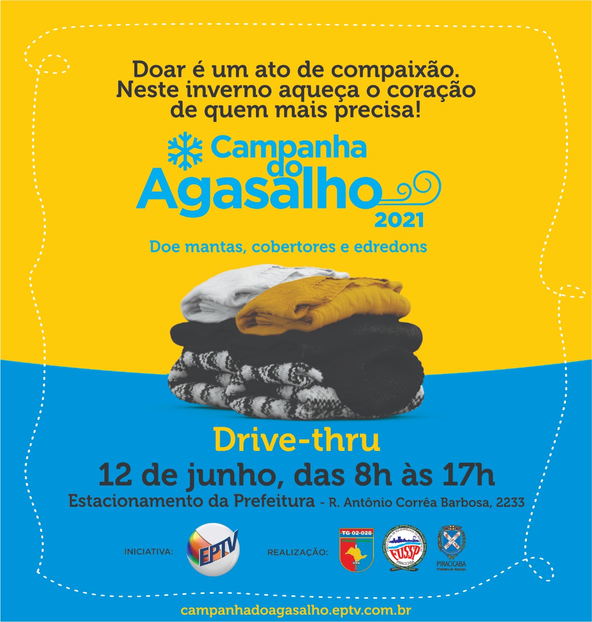 Piracicaba participa, no dia 12/06, sábado, do Drive Thru da Campanha do Agasalho 2021, iniciativa da EPTV em parceria com prefeituras da área de cobertura da emissora. As doações de mantas, cobertores, edredons e fraldas geriátricas, que podem ser feitas das 8h às 17h, no estacionamento da Prefeitura, serão repassadas ao Fundo Social de Solidariedade (Fussp). O material arrecadado será destinado às famílias em vulnerabilidade social encaminhadas pelos serviços socioassistenciais do município.