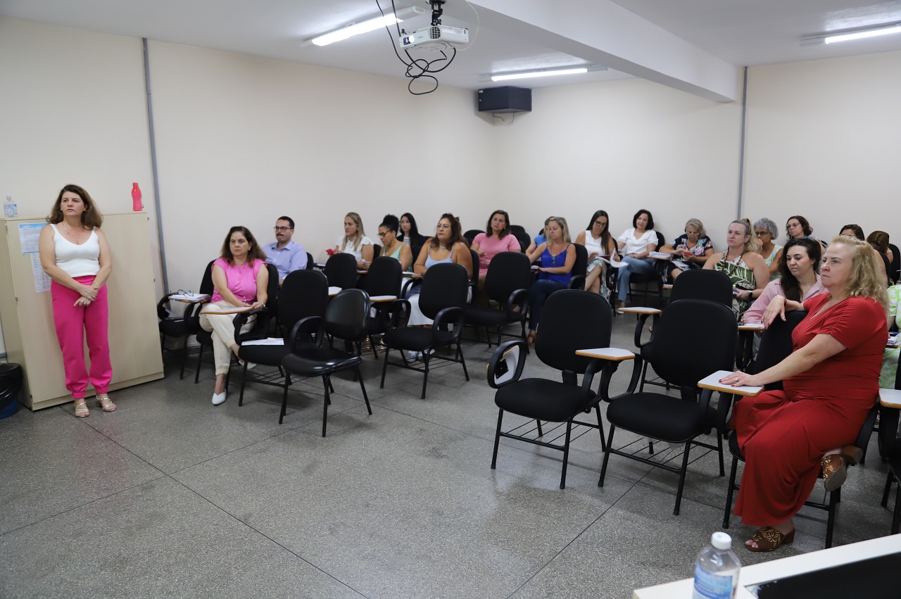 Ao lado de supervisoras, formadoras e equipe pedagógica da SME, este é o primeiro encontro de todo o setor com as novas coordenadoras pedagógicas de Educação Infantil e Ensino Fundamental, as professoras Viviane Regina Gimenes Cavalcante e Ana Lúcia Lorencetti Marra.