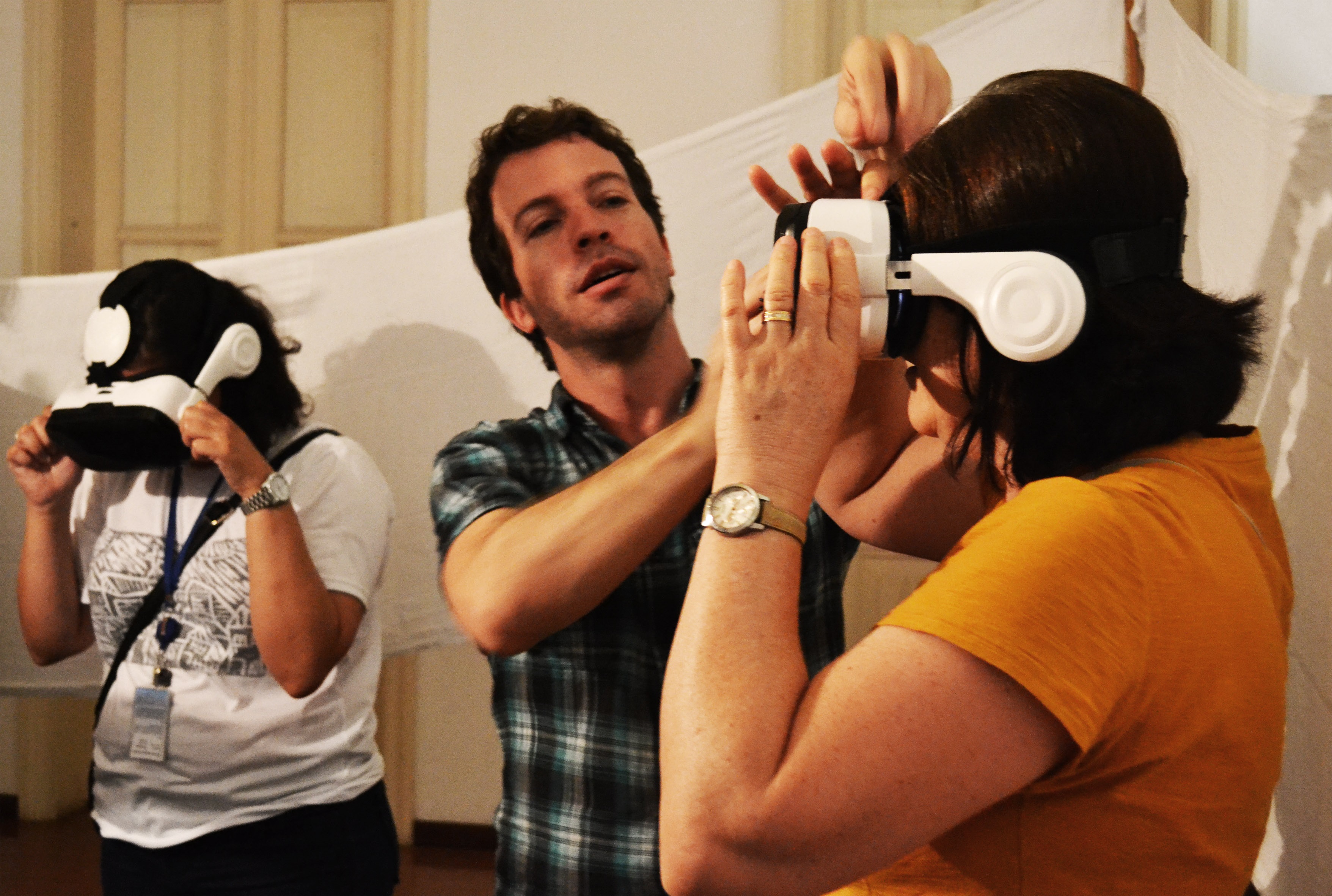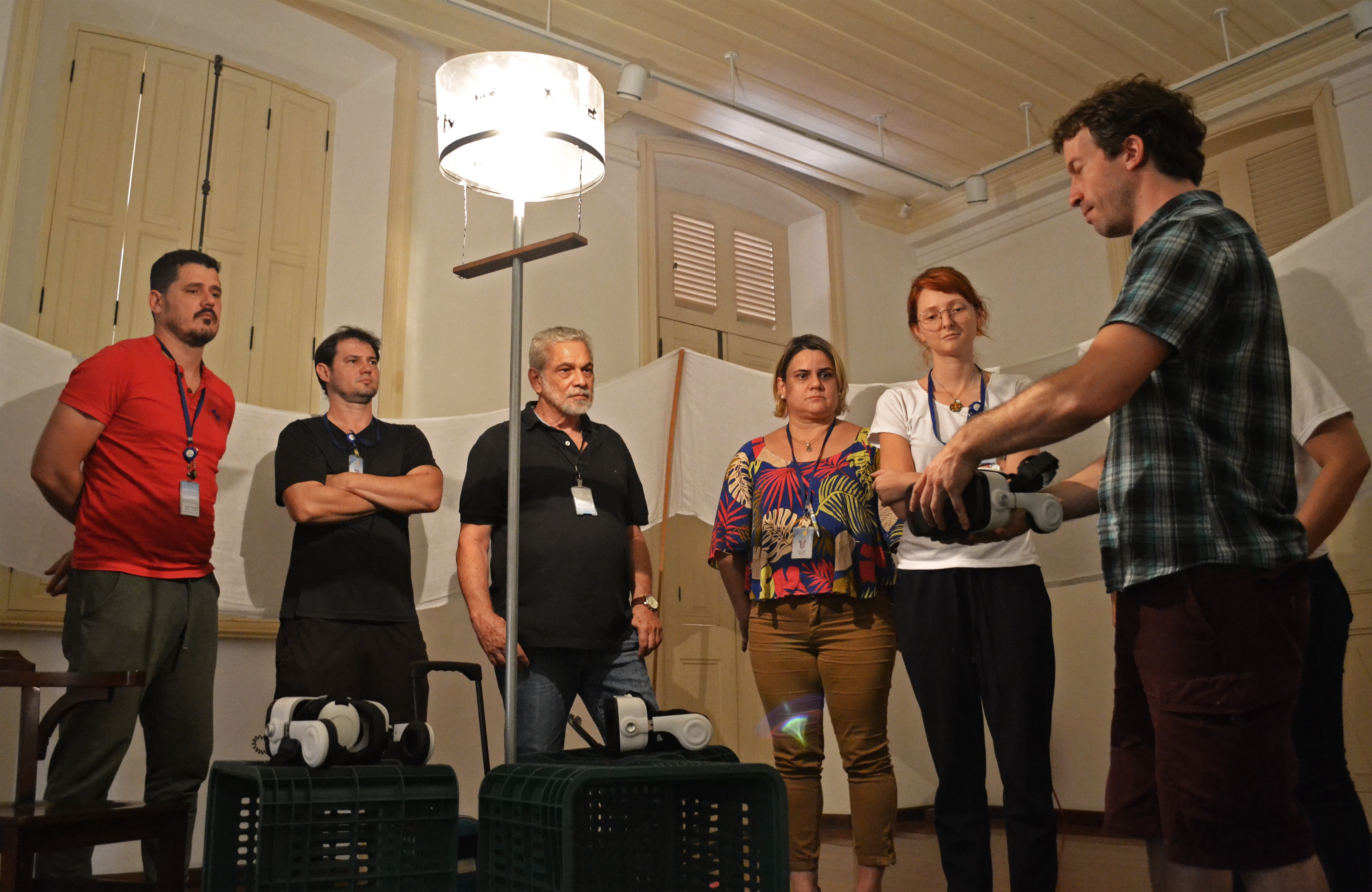 Os profissionais visitaram a instalação, que utiliza suportes interativos, óculos de realidade virtual, paisagem sonora e projeções sobre tecidos e participaram de um bate-papo com o coordenador da ação, o fotógrafo e psicólogo Paulo Munhoz e também com a musicista, professora e pesquisadora Ester Ferreira, que atua na construção e composição da paisagem sonora. O objetivo da mostra é trazer à tona as memórias e as vivências de crianças em situação de vulnerabilidade social.