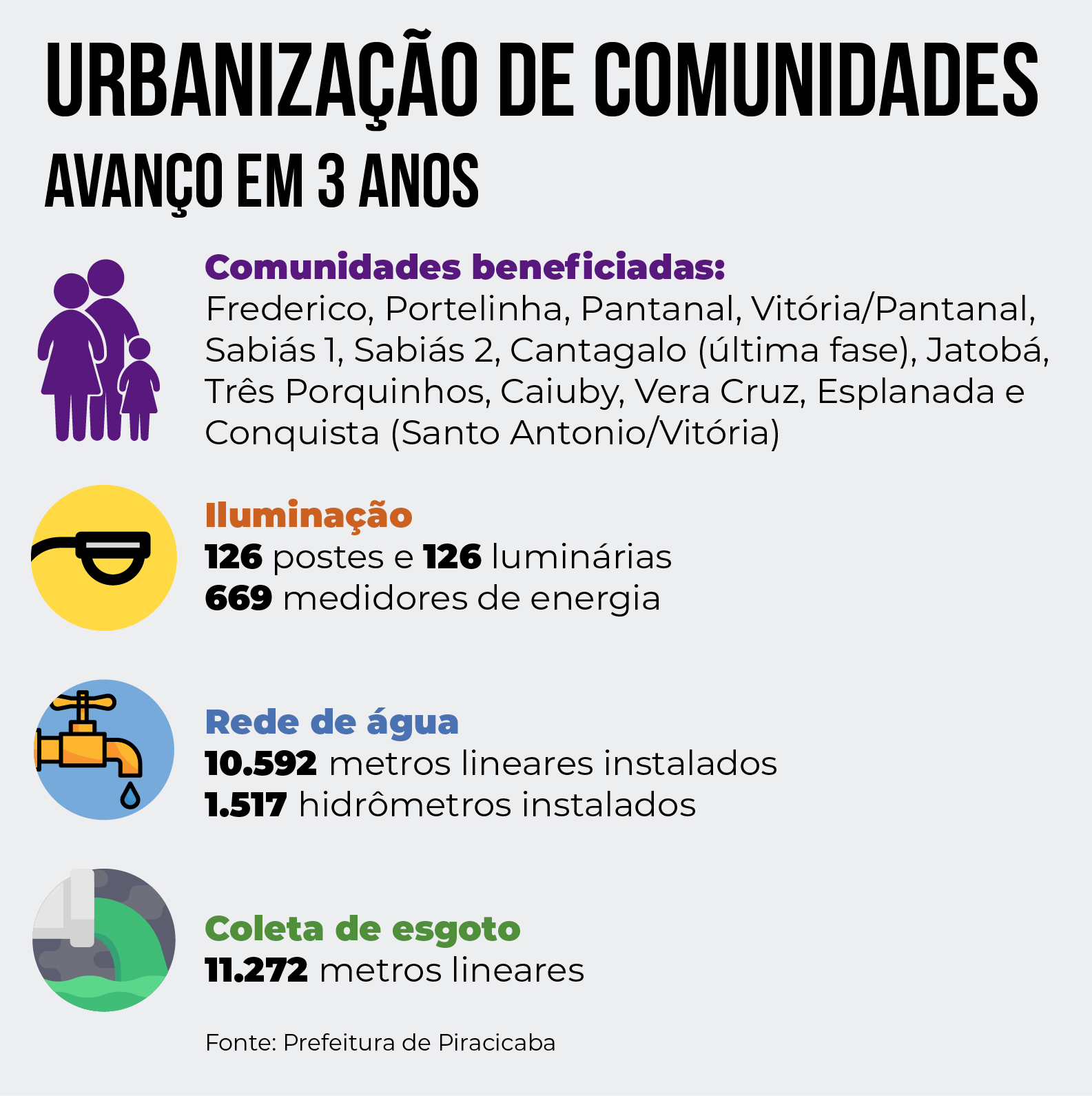 Nos últimos três anos, a Prefeitura de Piracicaba avançou na urbanização de 13 comunidades em Piracicaba. Mais de 1.510 famílias, que somam mais de 5.600 pessoas, foram beneficiadas diretamente com redes de água potável e de esgoto. Obras de drenagem de águas pluviais, pavimentação e iluminação beneficiaram mais de 1.800 famílias.