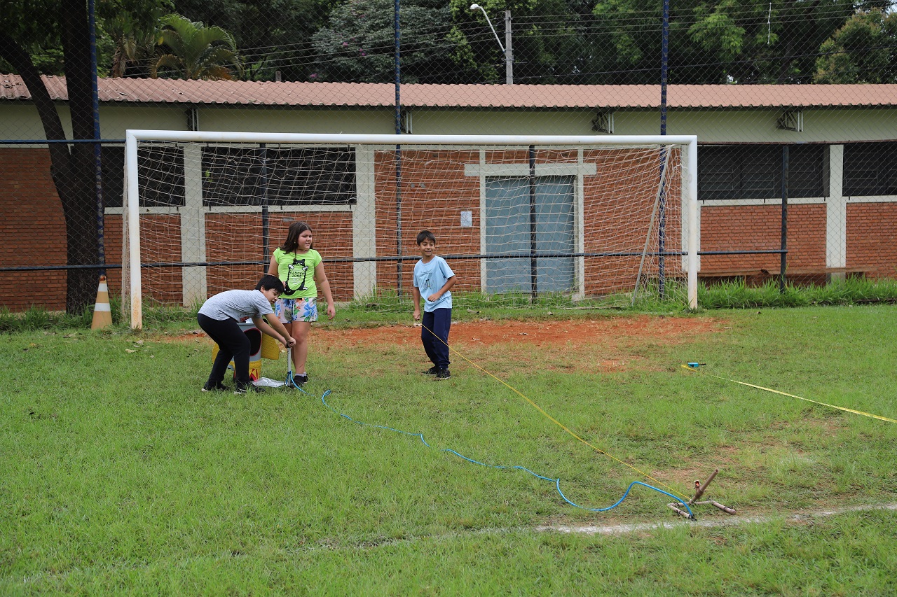 Os alunos fizeram os lançamentos dos foguetes em um campo de futebol ao lado da escola.