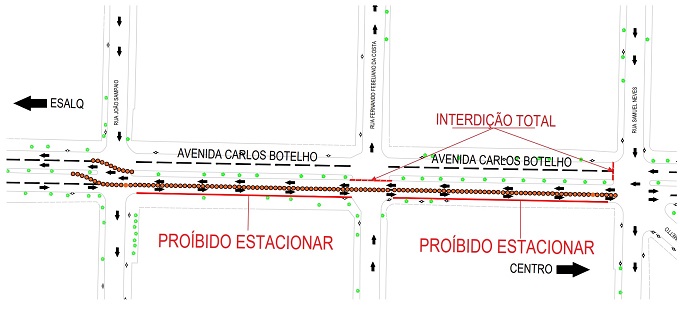 Para os veículos que se deslocarem no sentido Centro-Esalq, o desvio será à esquerda, seguindo no sentido contrário a partir da rua Samuel Neves até a rua Dr. João Sampaio.