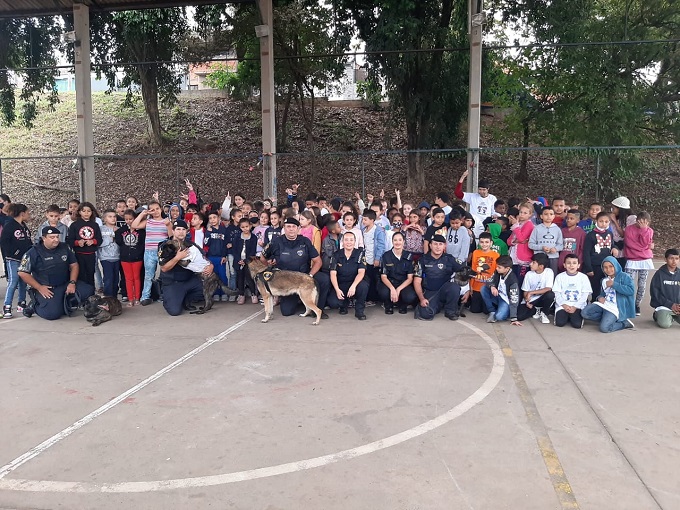 Comunidade escolar e GCMs do Pelotão Escolar e do Canil ao final da formatura de hoje