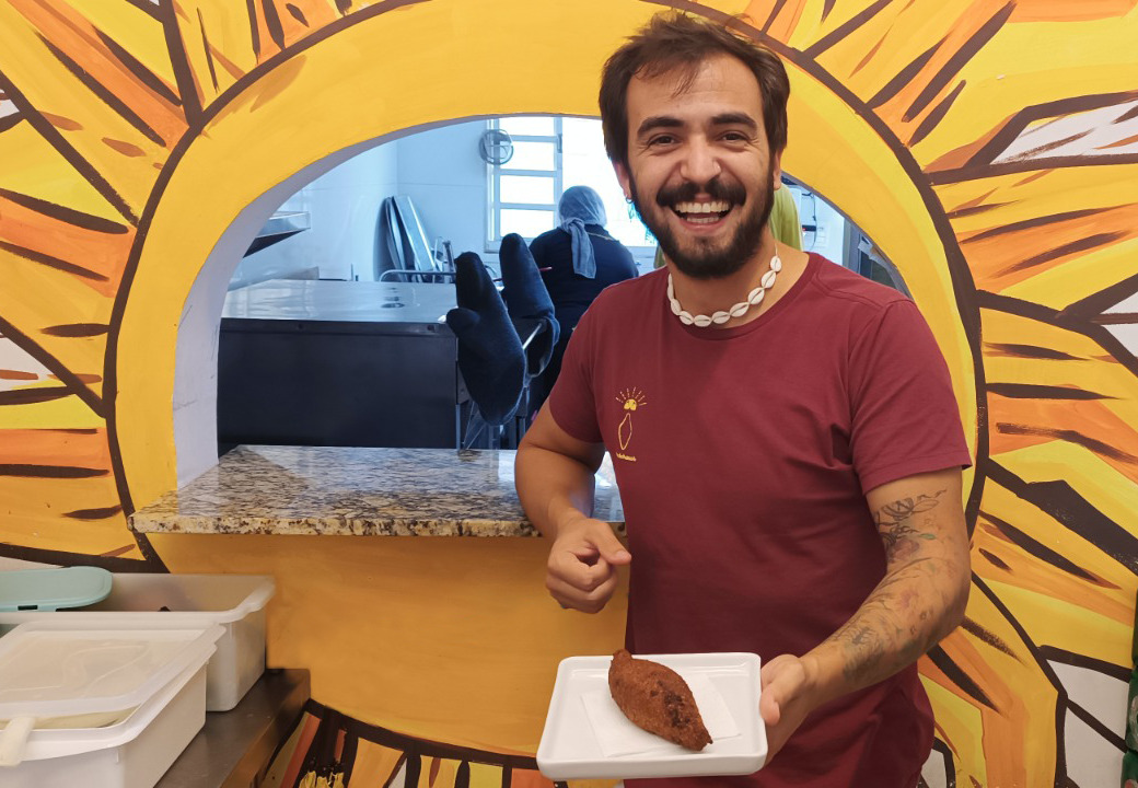 O empresário que atua com culinária árabe emprestou R$ 21 mil Jairo, responsável pela parte administrativa da operação, disse que as condições oferecidas pelo Banco do Povo são imbatíveis. “Nós já tínhamos feito um empréstimo para a abertura da 1ª loja em Santa Terezinha e agora voltamos a recorrer a esse crédito. Realmente são juros de pai para filho. Interessante que este valor emprestado pode ser utilizado em benfeitorias ou mesmo como capital de giro para aqueles que precisam ganhar um fôlego no dia-a-dia do seu negócio”, explicou. RECEITAS DE FAMÍLIA – Patrick Tambay Abau El Hossn, neto de libaneses, é o proprietário do KibedoHassib, especializado em culinária árabe localizado na rua Coronel Barbosa, 13. Ele está utilizando a linha de crédito Empreenda Rápido, para cobrir as áreas externas e trocar o piso do seu restaurante. A proposta é ampliar o espaço de atendimento, mantendo em segredo as receitas da família, em especial do quibe frito que é o carro-chefe de vendas.